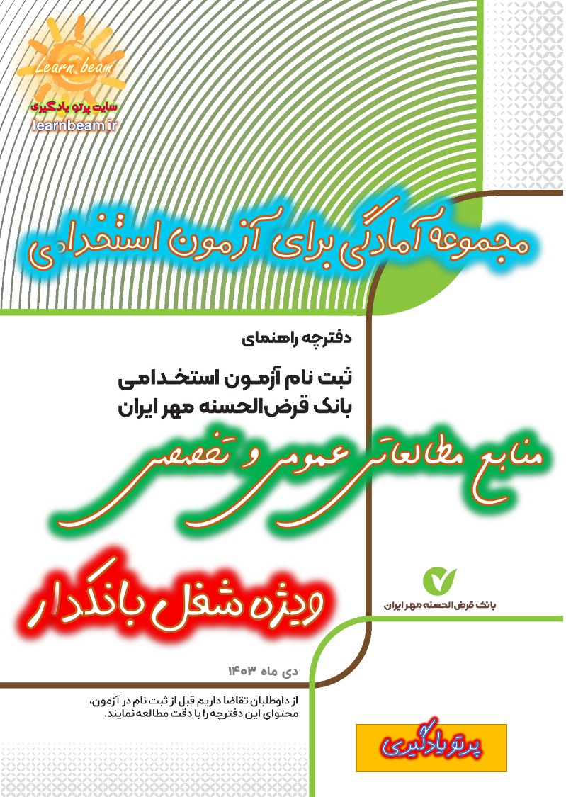 منابع مطالعاتی عمومی و تخصصی شغل بانکدار آزمون استخدامی بانک قرض الحسنه مهر ایران سال 1403 (عنوان شغلی بانکدار) مطابق با منابع اعلامی آگهی دعوت به همکاری بانک قرض الحسـنه مهر ایران به منظور بهرهمندی از توانمندی و قابلیت های جوانان جهت ایجاد تحول نوآورانه در عرصه بانکداری اکوسیستمی وهوشمند، در قالب عنوان های شغلی بانکدار (تمامی استان ها) و متصدی امور فناوری اطلاعات (صرفا استان تهران) از داوطلبان علاقمند به فعالیت درحوزه قرض الحسنه در سطح کشور دعوت به همکاری و همراهی می نماید داوطلبان محترم می توانند با تهیه مجموعه منابع مطالعاتی تهیه شده در حیطه عمومی: هوش و استعداد تحصیلی - زبان انگلیسی - اطلاعات عمومی و مبانی کامپیوتر و در حیطه تخصصی: دانش علوم بانکی، اقتصادی، بازارهای مالی و سرمایه و بازاریابی برای آزمون استخدامی این بانک خود را آماده و توانمند نمایند. تلاش گروه پرتو یادگیری با تهیه پک کامل این آزمون استخدامی ارائه پک کامل، راحتی و دستیابی عادلانه همه داوطلبین این آزمون استخدامی می باشد. ضمن آرزوی موفقیت برای یکایک عزیزان در تمام مراحل زندگی