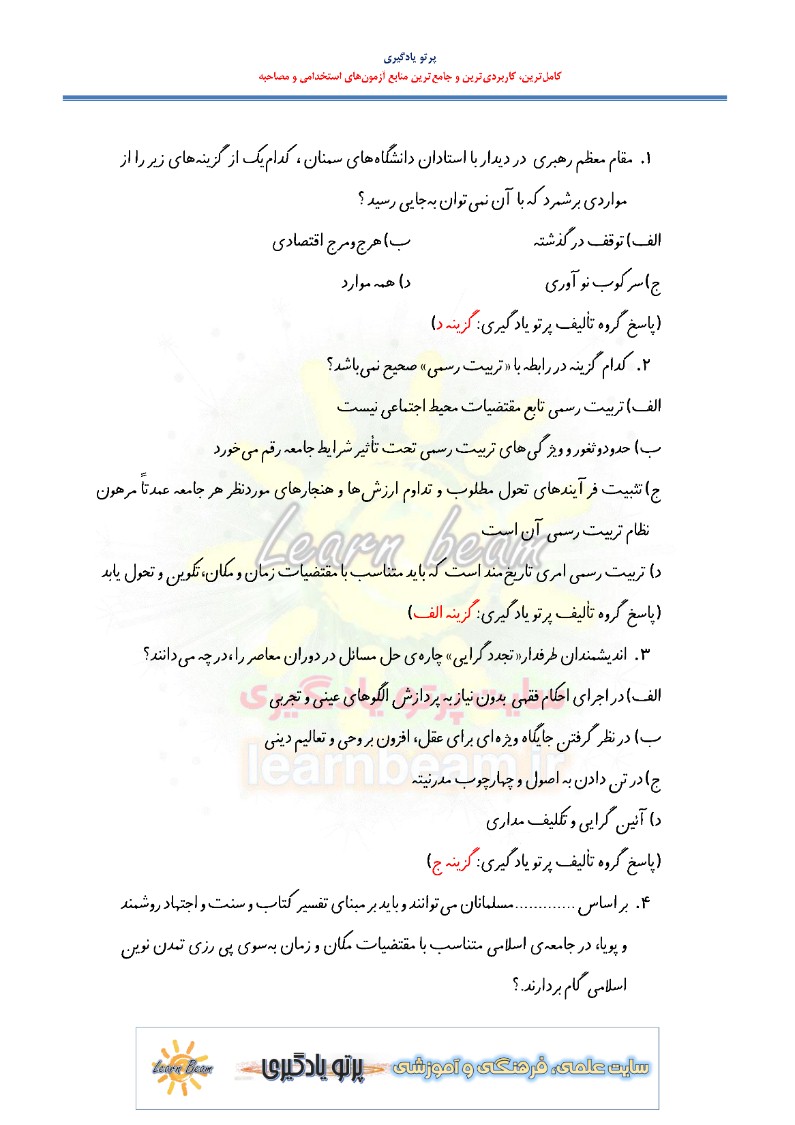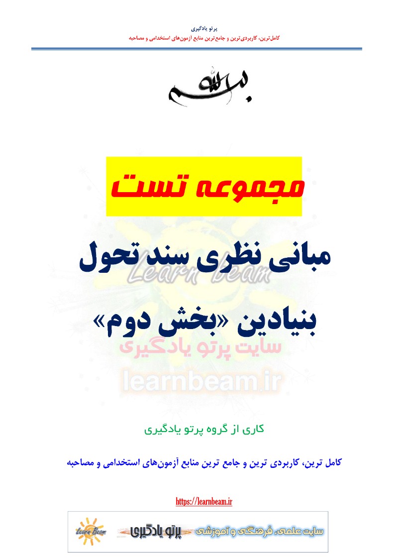 تست فصل دوم مبانی نظری سند تحول بنیادینسوالات تستی فصل دوم مبانی نظری سند تحول بنیادین شامل 134 تست در 33 صفحه در قالب فایل pdf قابل چاپ با کیفیت عالی جهت انسجام ذهنی، خودآزمایی و مطالعه سریع داوطلبین شرکت کننده در آزمون های استخدامی و آزمون کیفیت بخشی و آزمون استخدامی آموزش و پرورش مطابق با دفترچه راهنمای ثبت نام آزمون استخدام مشاغل آموزگار - دبیر و هنرآموز و داوطلبین شرکت کننده در آزمون مشاغل کیفیت بخشی آموزش و پرورش مطابق با سرفصل های سازمان اداری و استخدامی ویژه مشاغل آموزگاری، آموزگار استثنایی، هنر آموزی، دبیری، مربی تربیت بدنی و سلامت، امور تربیتی و مشاور، امور تربیتی و سبک زندگی و مشاور