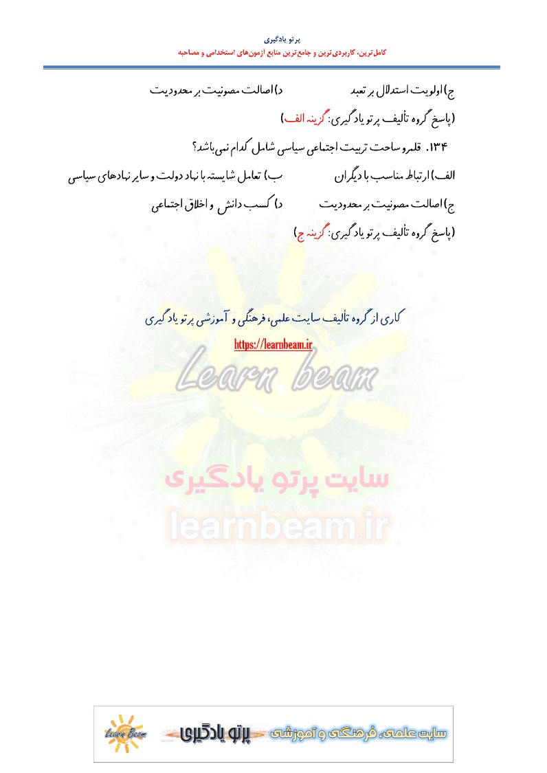 تست مبانی نظری سند تحول بنیادینسوالات تستی فصل دوم مبانی نظری سند تحول بنیادین شامل 134 تست در 33 صفحه در قالب فایل pdf قابل چاپ با کیفیت عالی جهت انسجام ذهنی، خودآزمایی و مطالعه سریع داوطلبین شرکت کننده در آزمون کیفیت بخشی آموزش و پرورش مطابق با دفترچه راهنمای ثبت نام آزمون استخدامی مشاغل آموزگار - دبیر و هنرآموز و داوطلبین شرکت کننده در آزمون کیفیت بخش آموزش و پرورش مطابق با سرفصل های سازمان اداری و استخدامی ویژه مشاغل آموزگاری، آموزگار استثنایی، هنر آموزی، دبیری، مربی تربیت بدنی و سلامت، امور تربیتی و مشاور، امور تربیتی و سبک زندگی و مشاور