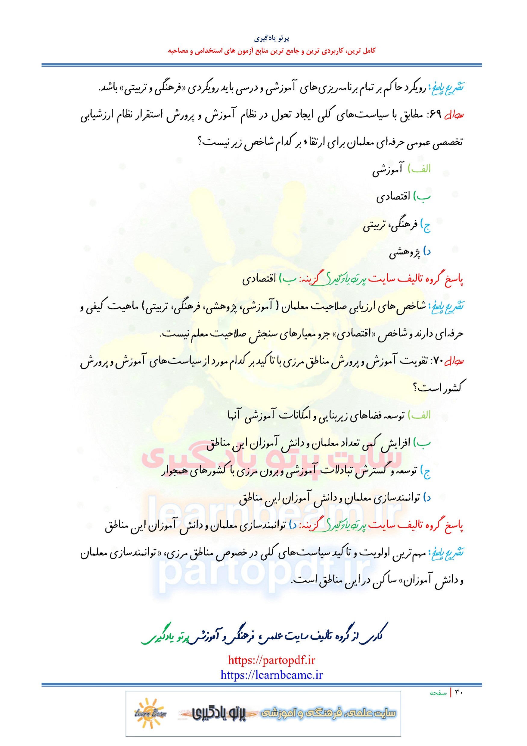 مجموعه تست سیاست های کلی تحول در آموزش و پرورش در 70 تست در 30 صفحه با پاسخ تشریحی در قالب فایل pdf قابل چاپ با کیفیت عالی جهت انسجام ذهنی، خودآزمایی و مطالعه سریع داوطلبین شرکت کننده در آزمون کیفیت بخش آموزش و پرورش سال 1403 مطابق با دفترچه راهنمای ثبت نام آزمون استخدام مشاغل و داوطلبین شرکت کننده در آزمون کیفیت بخش آموزش و پرورش می باشد. پک مجموعه سوالات و تست سیاست های کلی ایجاد تحول در آموزش و پرورش مطابق با سرفصل هایآزمون های استخدامی تدوین و تهیه گردیده است.