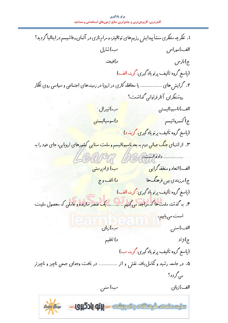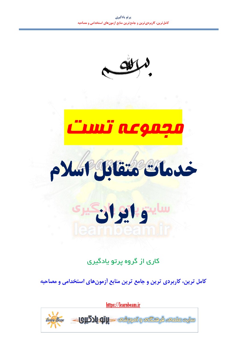 تست کتاب خدمات متقابل اسلام و ایران در 32 صفحه و 150 تست چهار گزینه ای در قالب فایل pdf قابل چاپ با کیفیت عالی جهت انسجام ذهنی، خودآزمایی و مطالعه سریع داوطلبین شرکت کننده در آزمون های استخدامی و آزمون اسخدامی آموزش و پرورش مطابق با دفترچه راهنمای ثبت نام و مطابق با سرفصل های اعلام شده در دفترچه راهنمای ثبت نام.