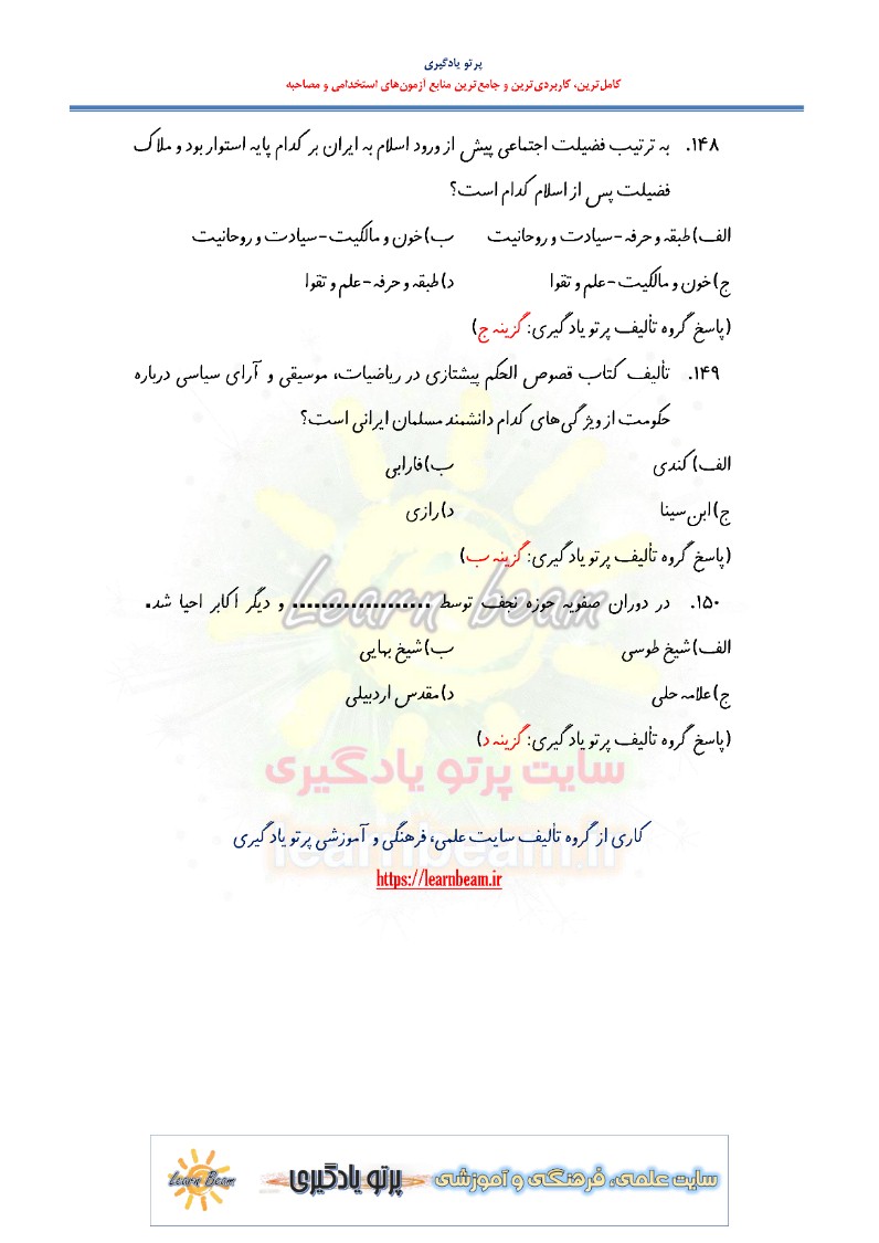 تست کتاب خدمات متقابل اسلام و ایران در 32 صفحه و 150 تست چهار گزینه ای در قالب فایل pdf قابل چاپ با کیفیت عالی جهت انسجام ذهنی، خودآزمایی و مطالعه سریع داوطلبین شرکت کننده در آزمونهای استخدامی و آزمون استخدامی استخدامی آموزش و پرورش مطابق با دفترچه راهنمای ثبت نام آزمون استخدامی سال 1403 مطابق با سرفصل های اعلامی در دفترچه راهنمای ثبت نام.