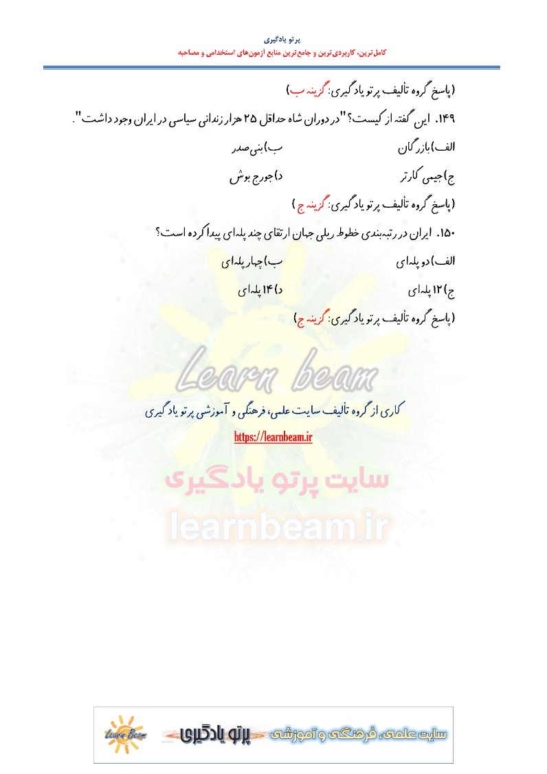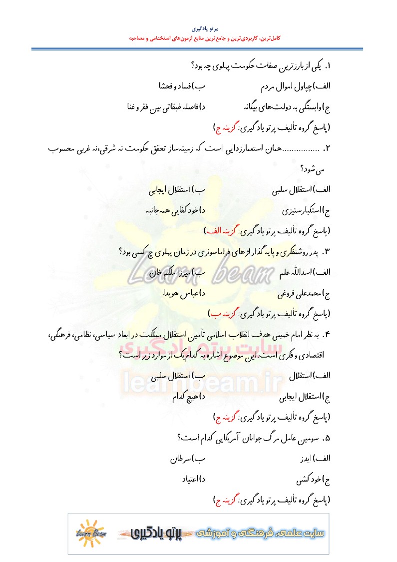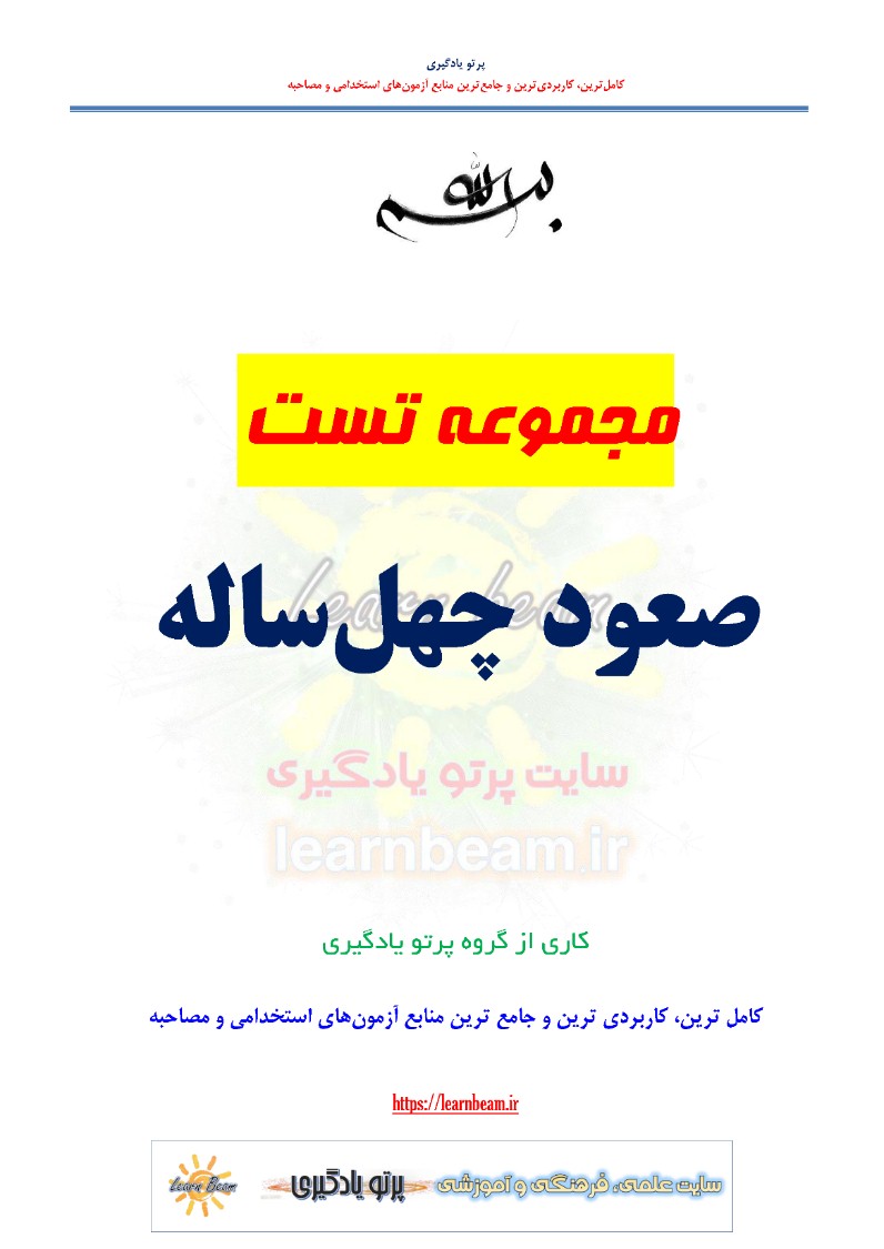 سوالات تستی کتاب صعود چهل ساله در 32 صفحه و 150 تست در قالب فایل pdf قابل چاپ با کیفیت عالی جهت انسجام ذهنی، خودآزمایی و مطالعه سریع داوطلبین شرکت کننده در آزمون های استخدامی و آزمون استخدامی آموزش و پرورش مطابق با دفترچه راهنمای ثبت نام مطابق با سرفصل های اعلام شده در دفترچه راهنمای ثبت نام.