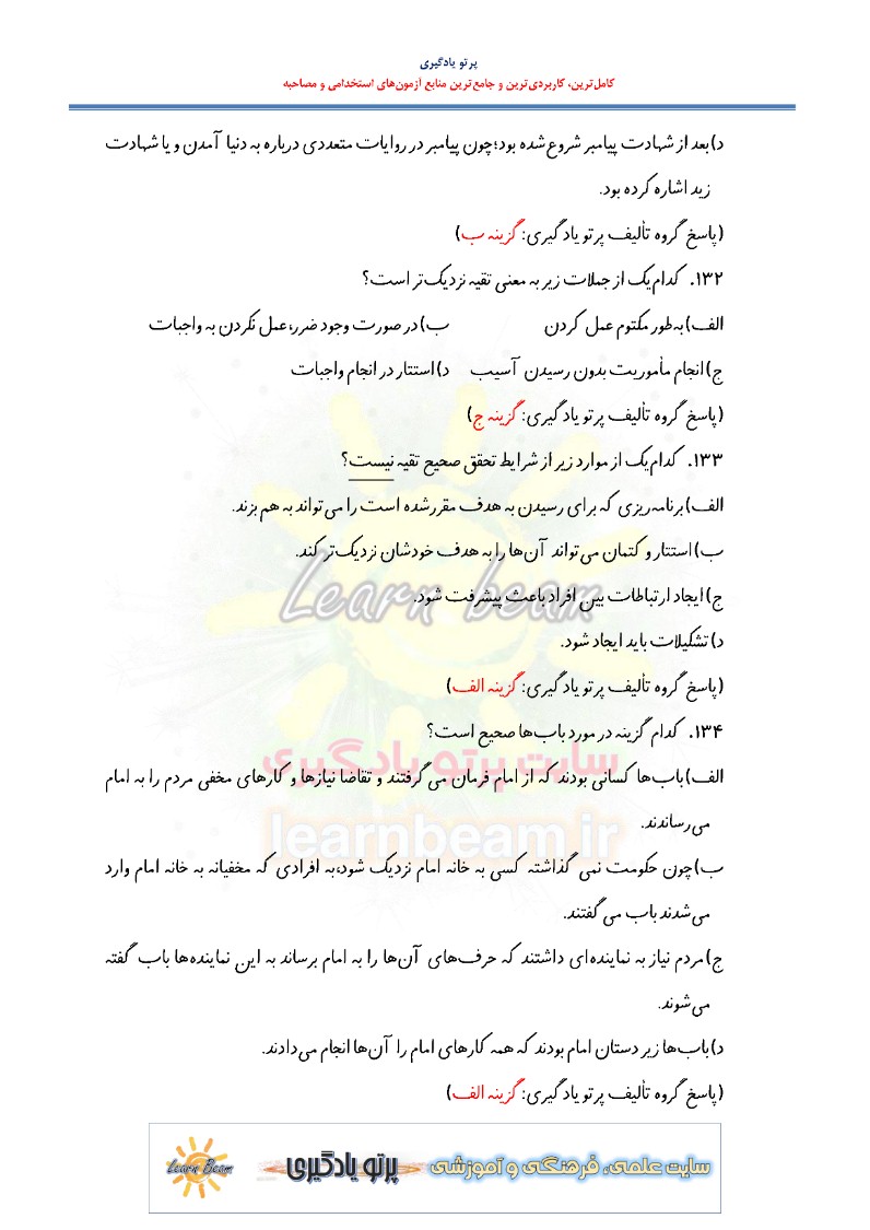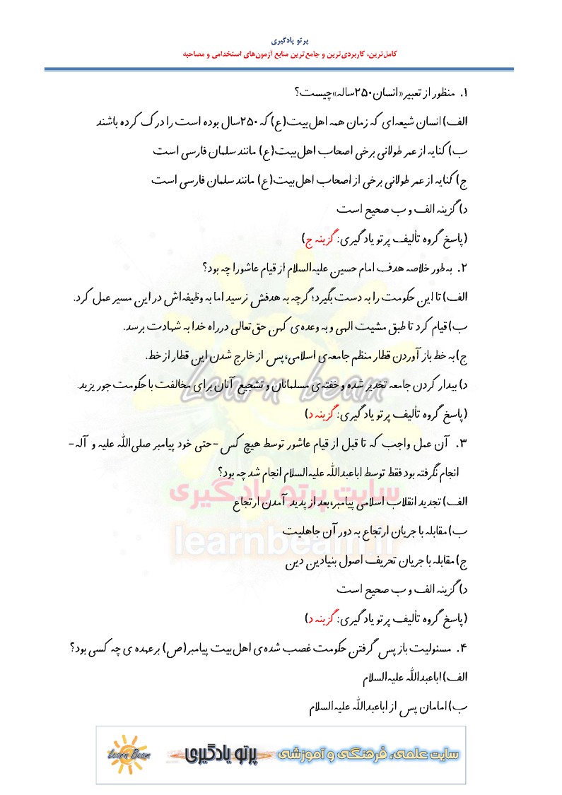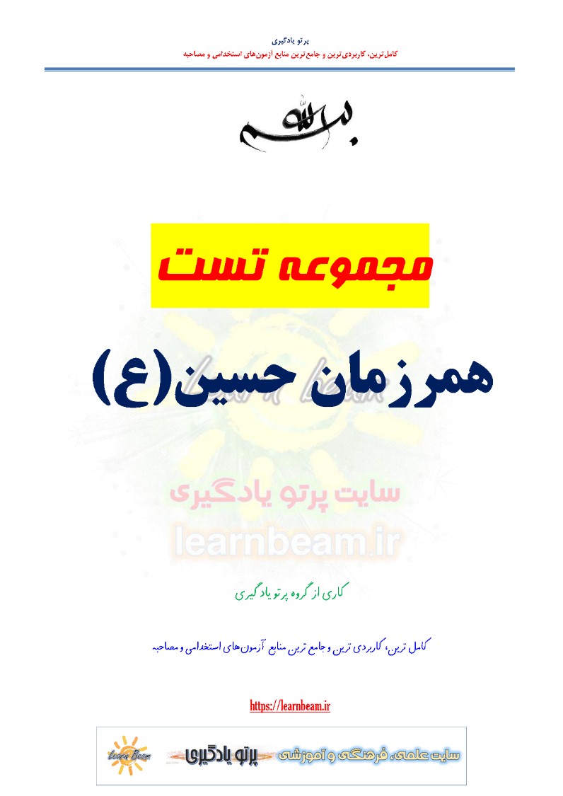 سوالات تستی کتاب همرزمان حسینن در 33 صفحه و 134 تست چهارگزینه ای در قالب فایل pdf قابل چاپ با کیفیت عالی جهت انسجام ذهنی، خودآزمایی و مطالعه سریع داوطلبین شرکت کننده در آزمون های استخدامی و استخدامی آموزش و پرورش مطابق با دفترچه راهنمای ثبت نام و مطابق با سرفصل های اعلام شده در دفترچه راهنمای ثبت نام.
