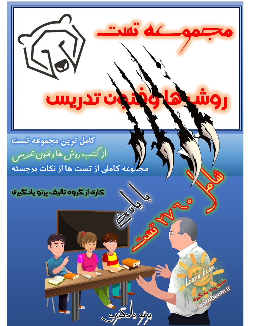 مجموعه تست کامل و جامع روش ها و فنون تدریس با 2760 تست در 648 صفحه در قالب فایل pdf. بهترین منبع برای آزمون استخدامی آموزش و پرورش و سایر آزمون های استخدامی مرتبط به همراه پاسخنامه که از فصول معتبرترین کتب روش ها و فنون تدریس استخراج شده است. مجموعه تست جامع روش ها و فنون تدریس آموخته های داوطلبین آزمون استخدامی را نظم بخشیده و منسجم می سازد. این مجموعه مرور سریع داوطلب را سبب می شود و آگاهی های وی را در زمینه مهارت ها و فنون تدریس و مهارت های کلاسی نظم بخشیده و یک آمادگی و شبیه سازی را برای جلسه آزمون به همراه دارد. به جرات می توان گفت این مجموعه جامع ترین مجموعه تست بوده و برای اولین بار در سایت پرتو یادگیری رونمایی می شود. مطالعه این منبع داوطلبین عزیز را از جستجوی سایر منابع تستی در خصوص کتب روش ها و فنون تدریس بی نیاز می سازد.