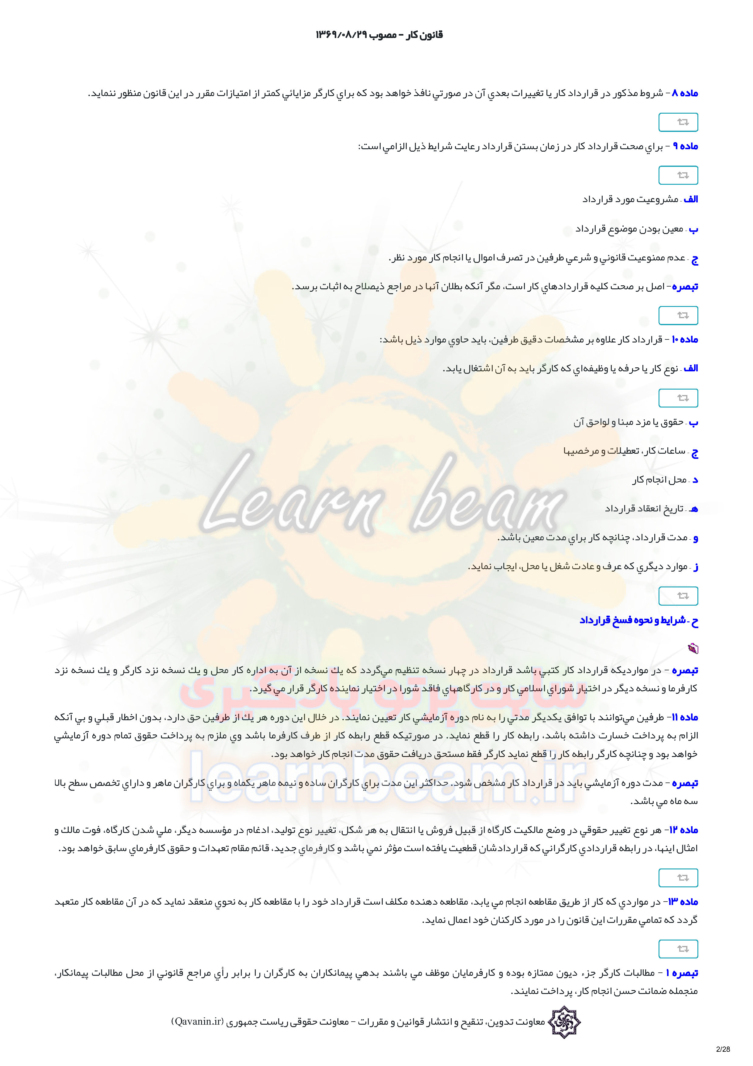 جزوه قانون کار در 29 صفحه در قالب فایل pdf. بهترین منبع برای آزمون های استخدامی. مجموعه تست قانون کار مطالب خوانده شده داوطلبین آزمون استخدامی را نظم بخشیده و منسجم می سازد. این مجموعه مرور سریع داوطلب را سبب می شود و آگاهی های وی را نظم بخشیده و یک آمادگی و شبیه سازی را برای جلسه آزمون به همراه دارد. مطالعه این منبع داوطلبین عزیز پیشنهاد می شود.