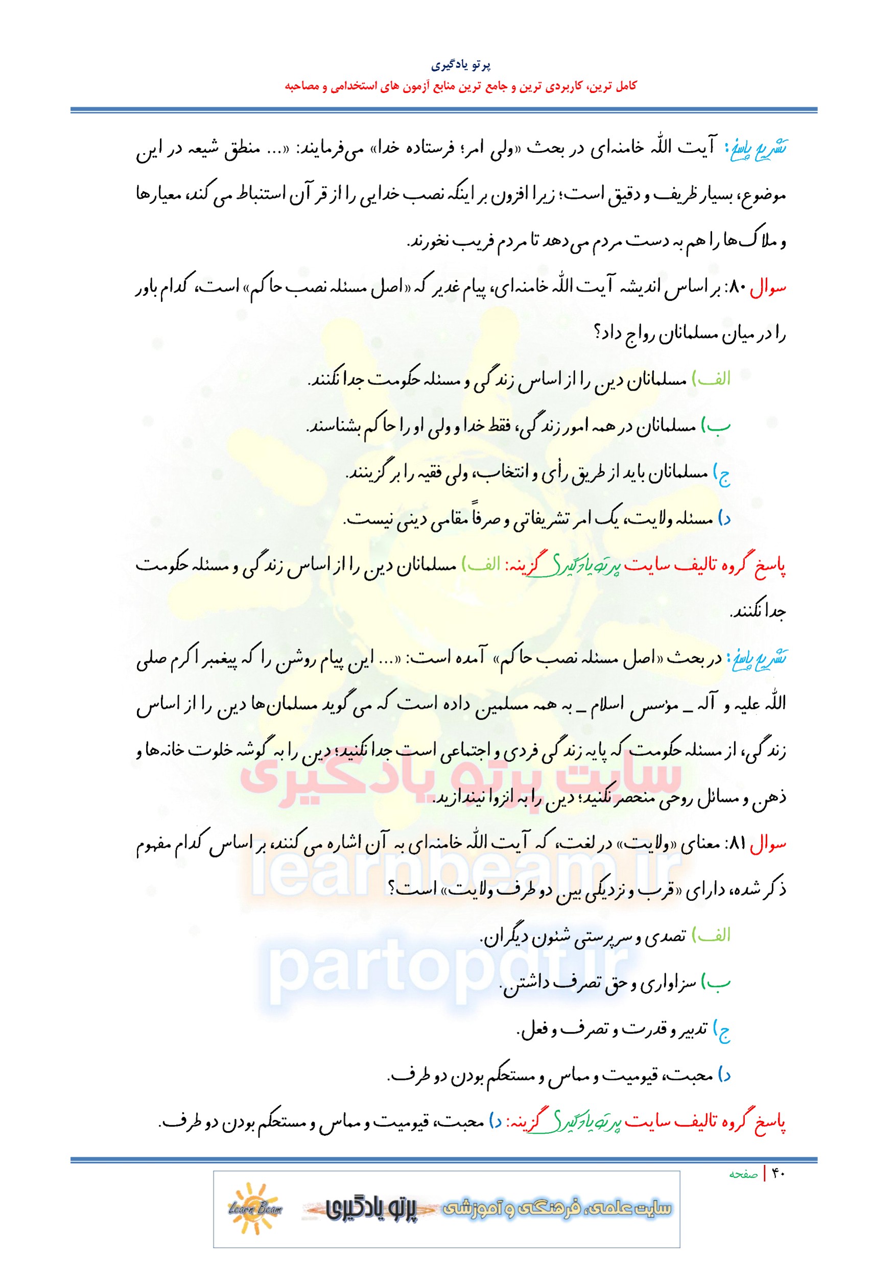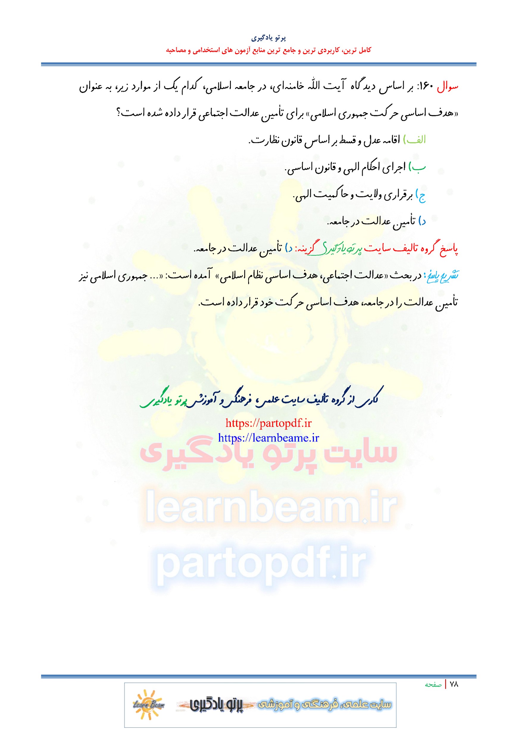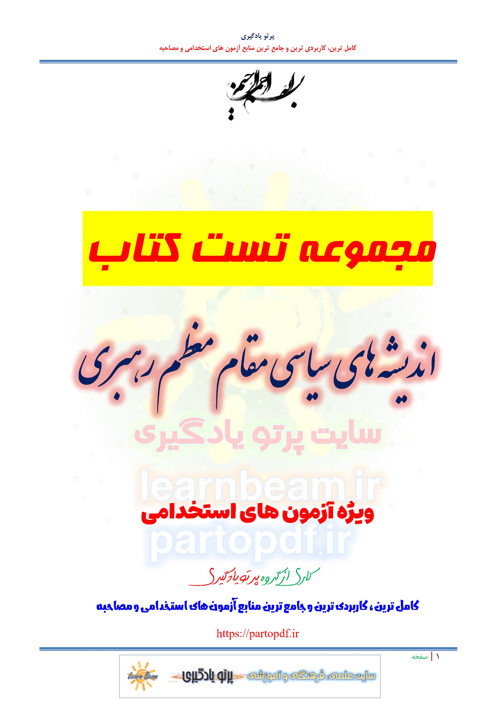 مجموعه سوالات تستی کتاب اندیشه های سیاسی مقام معظم رهبری شامل 160 تست با پاسخ در 78 صفحه در قالب فایل pdf. بهترین منبع برای آزمون های استخدامی. سوالات چهارجوابی اندیشه های سیاسی مقام معظم رهبری مطالب خوانده شده داوطلبین آزمون استخدامی را نظم بخشیده و منسجم می سازد. این مجموعه مرور سریع داوطلب را سبب می شود و آگاهی های وی را نظم بخشیده و یک آمادگی و شبیه سازی را برای جلسه آزمون به همراه دارد. مطالعه این منبع برای همه داوطلبین آزمون های استخدامی پیشنهاد می شود.