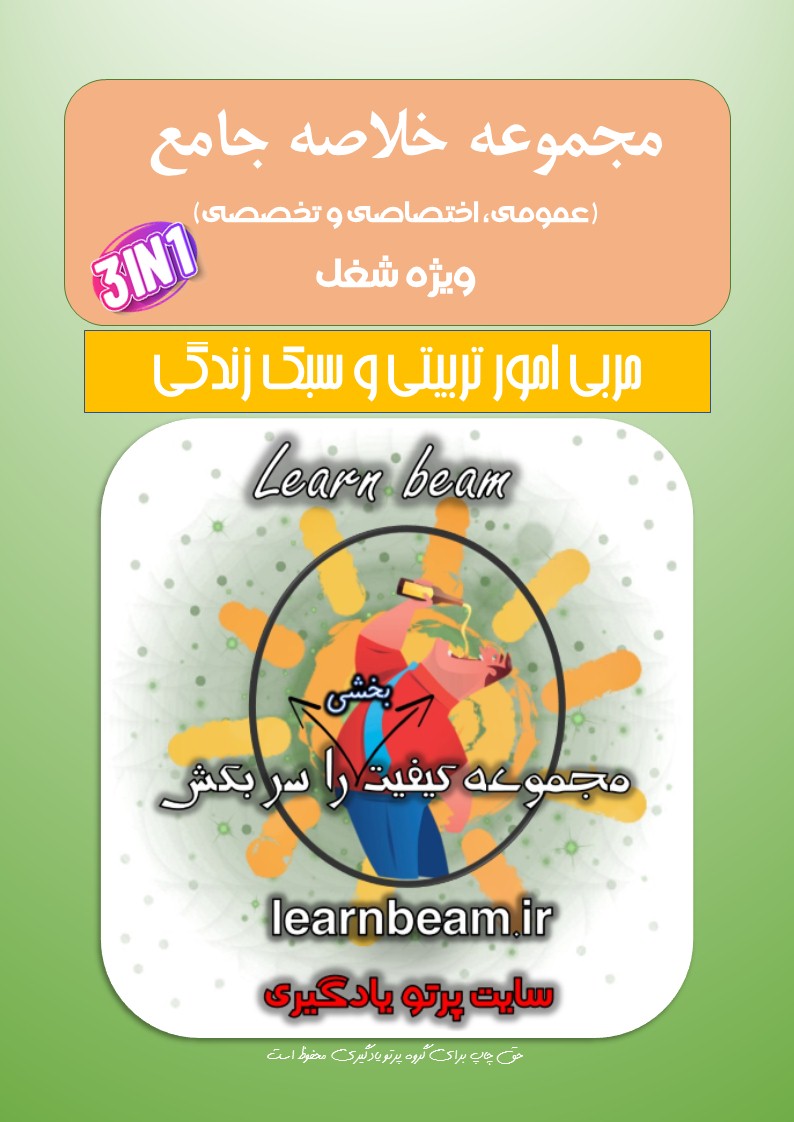 مجموعه خلاصه منابع عمومی، اختصاصی و تخصصی شغل مربی امور تربیتی و سبک زندگی (سه منبع در یک منبع) بصورت فشرده و مناسب برای روز های پایانی (جهت انسجام کامل ذهنی و آمادگی کامل برای امتحان) در قالب فایل pdf و مطابق با دفترچه ثبت نام آزمون استخدام مشاغل کیفیت بخشی سال 1403 که در 386 صفحه (برای اولین بار در کشور) تدوین شده است. مجموعه خلاصه کامل منابع شغل مربی امور تربیتی و سبک زندگی جهت تجمیع ذهنی نهایی داوطلبین تهیه و برای جا ماندگان از قافله مطالعه آزمون شدیدا توصیه می گردد. مطالب گلچینی دقیق و ظریف از محتوای منابع عمومی، اختصاصی و تخصصی شغل مربی امور تربیتی و سبک زندگی بوده و امکان آشنایی با مباحث مهم همه منابع را برای داوطلبینی که به هر دلیلی نتوانسته اند به طور کامل منابع امتحانی را مطالعه، مرور و بررسی نمایند و همچنین برای همه داوطلبینی که مطالب راخوانده اند ولی موفق به تجمیع و سازماندهی ذهنی نشده اند، تدارک دیده شده است. در سایه پک خلاصه «امور تربیتی و سبک زندگی را سر بکش» داوطلبین عزیز می توانند با انگیزه و انرژی مضاعف در جلسه امتحانی حاضر شده و در این آزمون قبول و پذیرفته شوند.