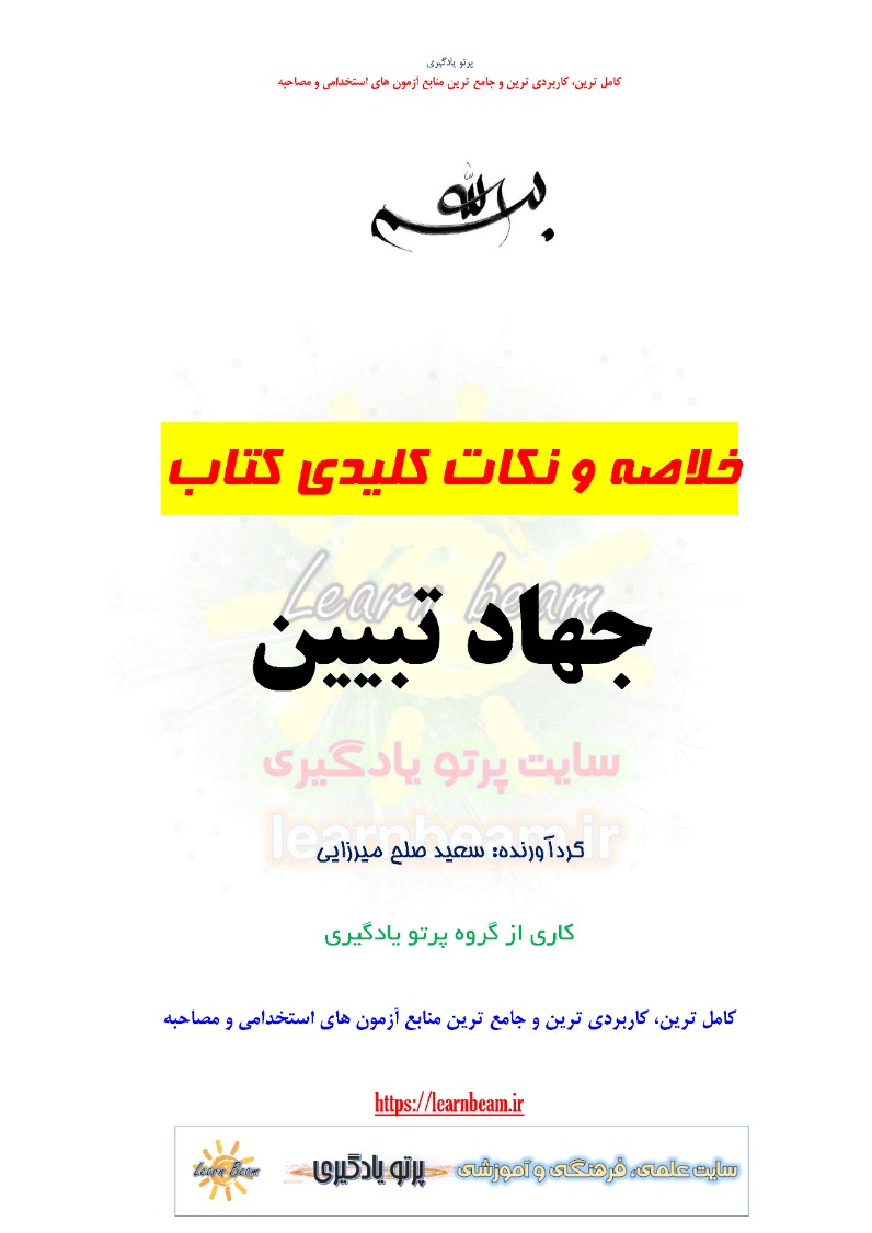 خلاصه کتاب جهاد تبیین در اندیشه آیت الله خامنه ای خلاصه منبع تخصصی آزمون های استخدامی مطابق با دفترچه راهنمای ثبت نام آزمون های استخدامی در قالب فایل pdf در 48 صفحه. جزوه خلاصه و نکات کلیدی کتاب جهاد تبیین شامل نکات اصلی تمامی فصل های کتاب می باشد که به صورت تایپ شده و با کیفیت عالی بوده و مناسب برای مرور و جمع بندی سریع در زمان کوتاه است. تهیه و مطالعه خلاصه و نکات کلیدی کتاب جهاد تبیین در اندیشه آیت الله خامنه ای برای داوطلبین آزمون های استخدامی پیشنهاد می گردد.