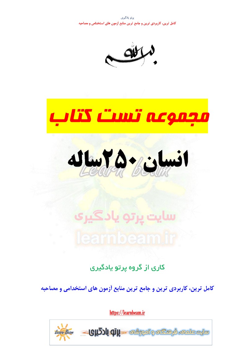 مجموعه تست کتاب انسان 250 ساله در 73 تست باپاسخ در 18 صفحه در قالب فایل pdf پی دی اف قابل چاپ با کیفیت عالی جهت انسجام ذهنی، خودآزمایی و مطالعه سریع داوطلبین شرکت کننده در آزمون های استخدامی مطابق با دفترچه راهنمای ثبت نام آزمون های استخدامی
