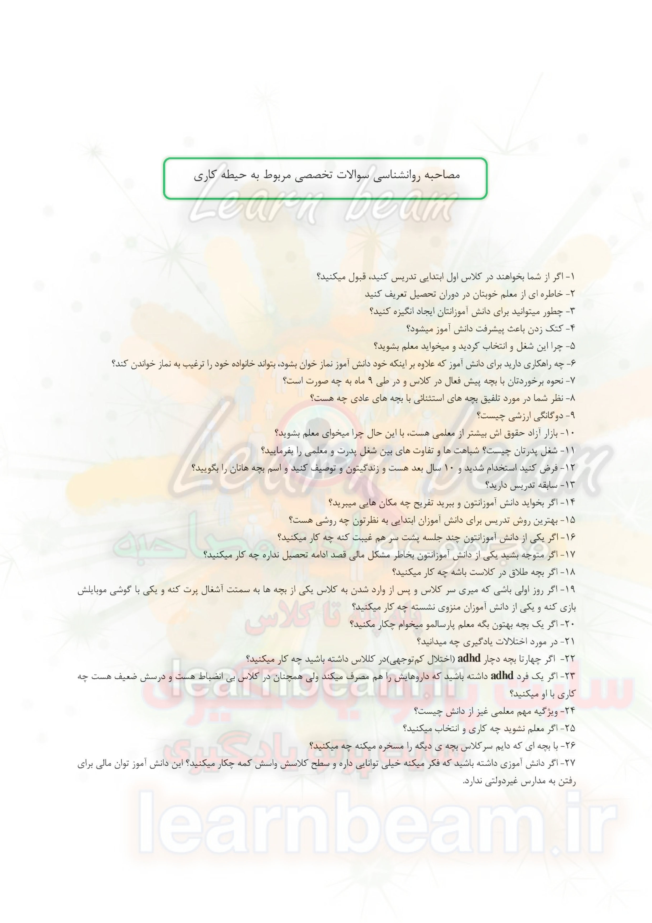 جزوه مصاحبه آزمون دبیری و هنرآموز سال 1403 بصورت کامل و جامع با نام لذت مصاحبه پله پله تا کلاس کامل ترین مجموعه گردآوری شده آمادگی برای مصاحبه آزمون دبیری و هنرآموز استخدامی آموزش و پرورش سال 1403 می باشد. جزوه مصاحبه استخدام آزمون دبیری و هنرآموز جزوه آمادگی برای مصاحبه آزمون دبیری و هنرآموز در سه بخش عمومی اختصاصی و تخصصی مطابق با سرفصل های اعلامی دفترچه راهنمای ثبت نام می باشد که شامل: راهنمایی های عمومی در خصوص نحوه حضور در جلسه مصاحبه ترسیم چارچوب سوالات و فضای مصاحبه در کانون های ارزیابی ارایه تمامی سوالات احتمالی در حیطه گزینش مذهبی ارایه بانک جامع اطلاعاتی در خصوص سرفصل های اعلامی جلسه مصاحبه و مطالب مفید در خصوص ساحت های تربیتی، تولید محتوای الکترونیکی و بازی وارسازی به همراه نمونه ای از بازی وارسازی برای کتب درسی مقطع متوسطه های در 790 صفحه pdf است. به جرات می توان گفت این مجموعه کامل ترین و جامع ترین مجموعه گردآوری شده آمادگی برای مصاحبه دبیری و هنرآموزی استخدامی آموزش و پرورش سال 1403 می باشد که توسط تیم تالیف پرتو یادگیری برای اولین بار در ایران تالیف شده است.