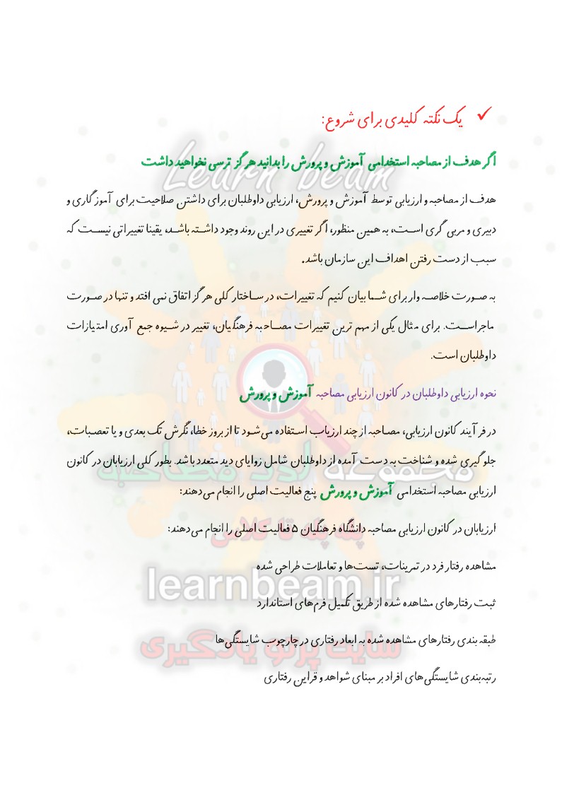 جزوه مصاحبه کانون ارزیابی بحث گروهی آموزش و پرورش. جزوه اختصاصی کانون ارزیابی بحث آمادگی برای مصاحبه آموزش و پرورش/ دانشگاه فرهنگیان/ مشاغل کیفیت بخشی/ دبیری و هنرآموز است. این پک مجموعه ای کامل برای موفقیت در مصاحبه های استخدامی آموزش و پرورش و دانشگاه فرهنگیان است. مجموعه حاضر با گردآوری مطالب مرتبط و بروز طبق اعلام آخرین اطلاعیه های رسمی استخدامی آموزش و پرورش و دانشگاه فرهنگیان در حیطه کانون ارزیابی بحث گروهی سعی نموده شما را به صورت اختصاصی و کامل در این زمینه پوشش دهد. جزوه مصاحبه کانون ارزیابی بحث گروهی 0 تا 100 این کانون ارزیابی را پوشش داده و با ارائه مطالب بسیار مفید و نکات کلیدی و ارزنده شما را در میان دیگر شرکت کنندگان برجسته و منتخب نماید. این مجموعه با ارائه مثال ها، نمونه ها و توصیه های مهم در خصوص بحث گروهی دانش ذهنی و مهارت شما را برجسته می نماید. تلاش گروه پرتو یادگیری با تهیه پک کامل کانون ارزیابی بحث گروهی دستیابی عادلانه همه داوطلبین این فرایند استخدامی به منابع و مهارت کامل می باشد. با آرزوی موفقیت برای یکایک عزیزان در مصاحبه های استخدامی پیش رو.