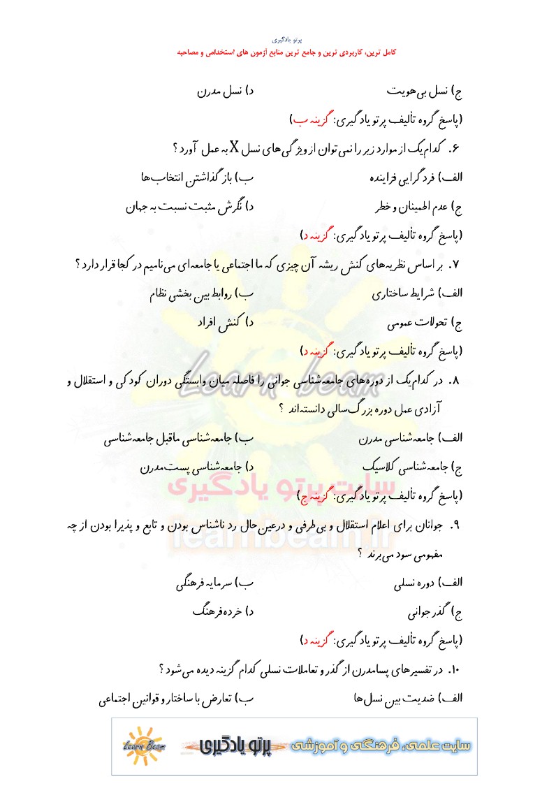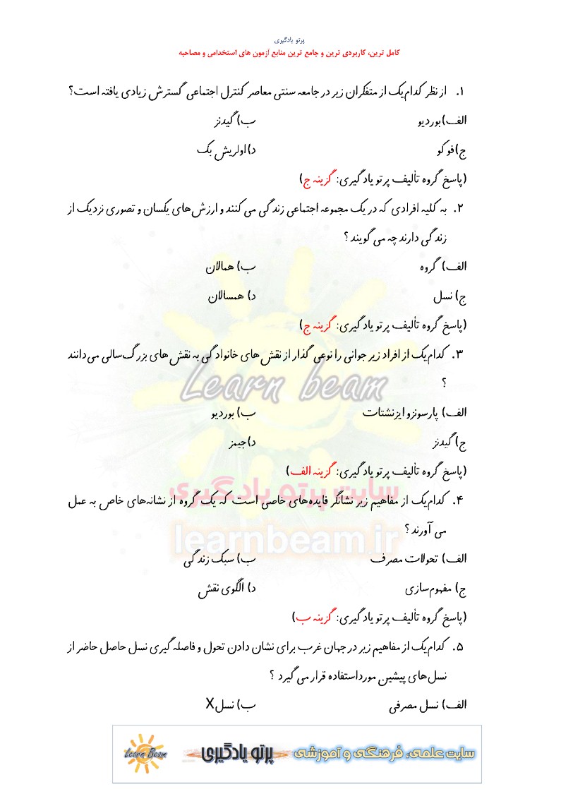 تست جامعه شناسی جوانان مجموعه سولات تستی جامعه شناسی جوانان شامل 150 سوال تستی باپاسخ در 33 صفحه در قالب فایل pdf می باشد. مجموعه سوالات تستی جامعه شناسی جوانان قابل چاپ با کیفیت عالی جهت انسجام ذهنی، خودآزمایی و مطالعه سریع داوطلبین شرکت کننده در دوازدهمین امتحان مشترک فراگیر دستگاه های اجرایی کشور و استخدامی وزارت ورزش و جوانان و منابع تخصصی و اختصاصی کارشناس برنامه ریزی امور ورزش در سال 1403 مطابق با دفترچه راهنمای ثبت نام آزمون و اصلاحیه نهایی می باشد.