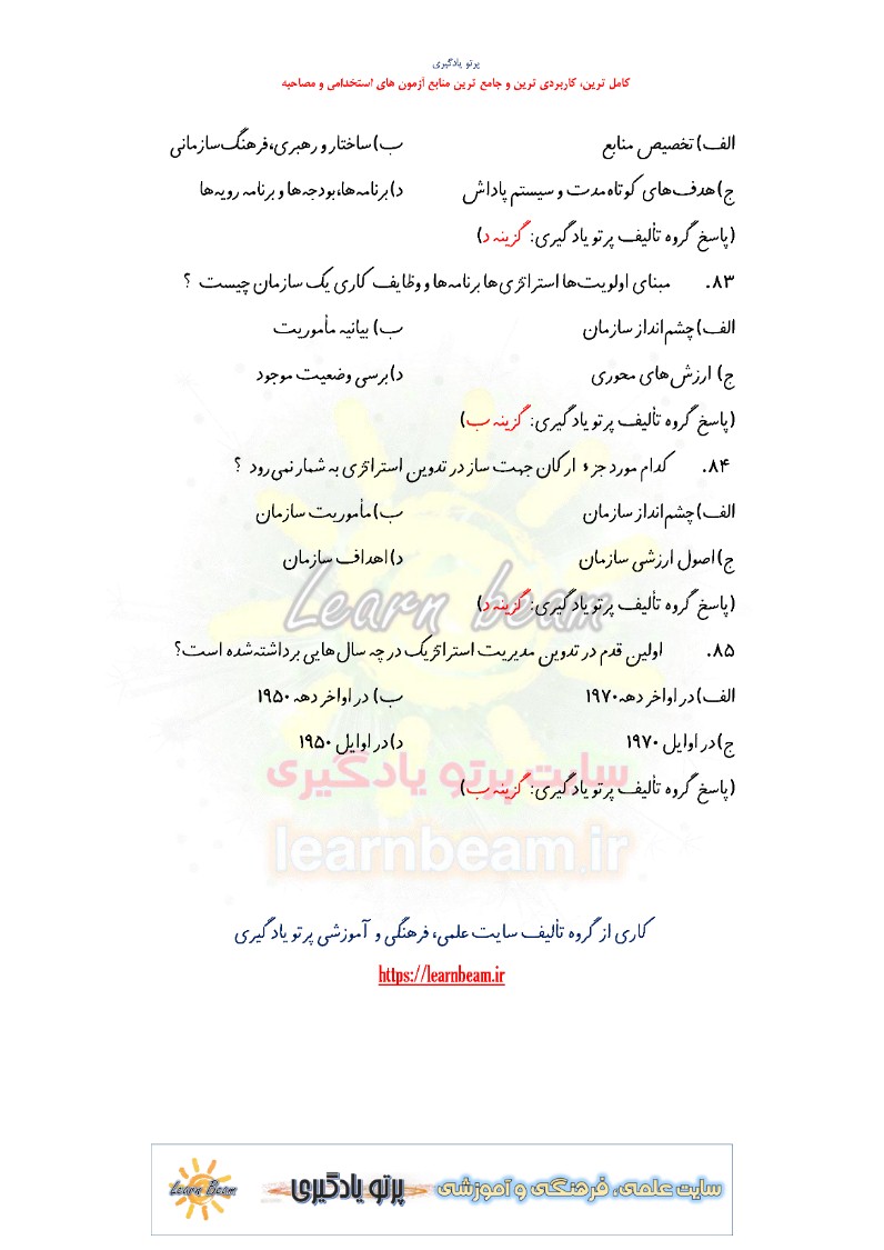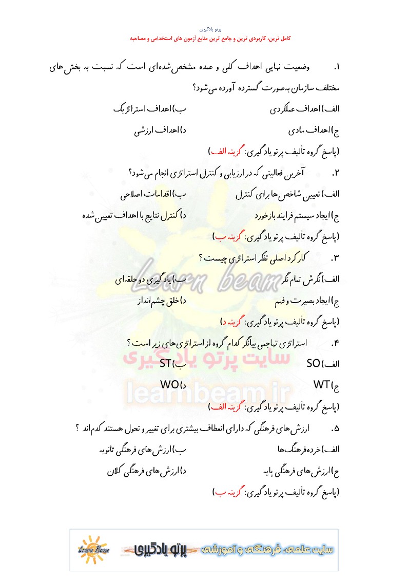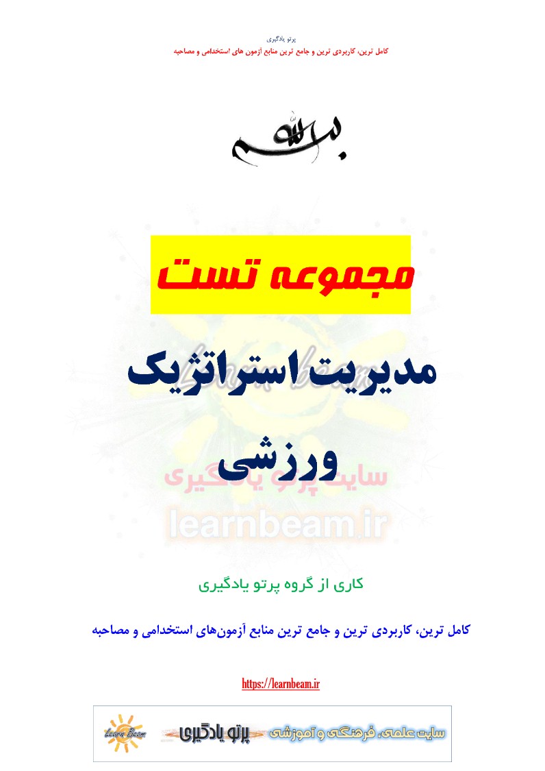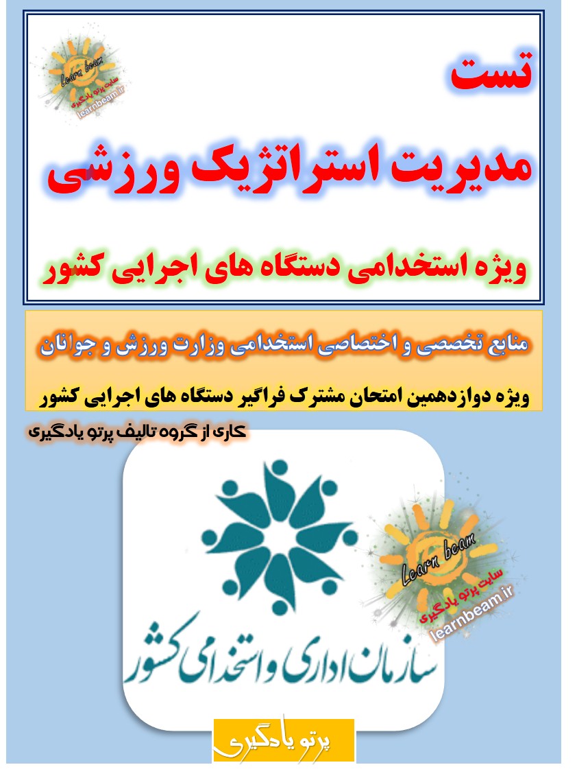 تست مدیریت استراتژیک ورزشی شامل 85 تست باپاسخ در 19 صفحه در قالب فایل pdf قابل چاپ با کیفیت عالی جهت انسجام ذهنی، خودآزمایی و مطالعه سریع داوطلبین شرکت کننده در دوازدهمین امتحان مشترک فراگیر دستگاه های اجرایی کشور و استخدامی وزارت ورزش و جوانان مطابق با دفترچه ثبت نام و مطابق با سرفصل های اعلام شده در دفترچه راهنمای ثبت نام منابع تخصصی و اختصاصی کارشناس برنامه ریزی امور ورزش می باشد.