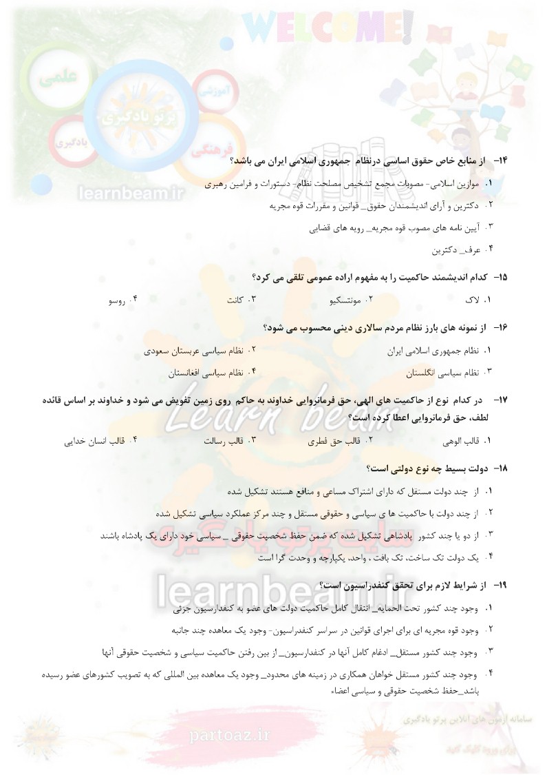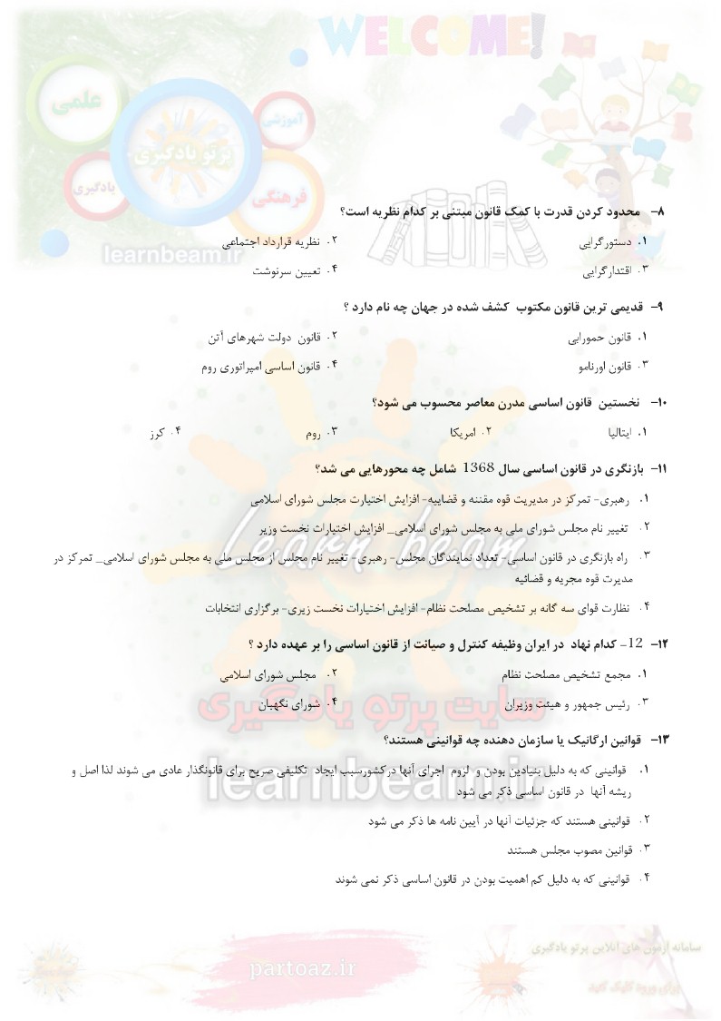 تست حقوق اساسی شامل 150 تست باپاسخ در 27 صفحه در قالب فایل pdf قابل چاپ با کیفیت عالی جهت انسجام ذهنی، خودآزمایی و مطالعه سریع داوطلبین شرکت کننده در آزمون های استخدامی دستگاه های اجرایی مطابق با دفترچه راهنمای ثبت نام و مطابق با سرفصل های اعلام شده در دفترچه راهنمای ثبت نام می باشد