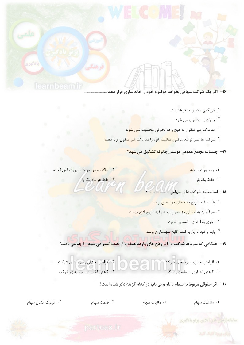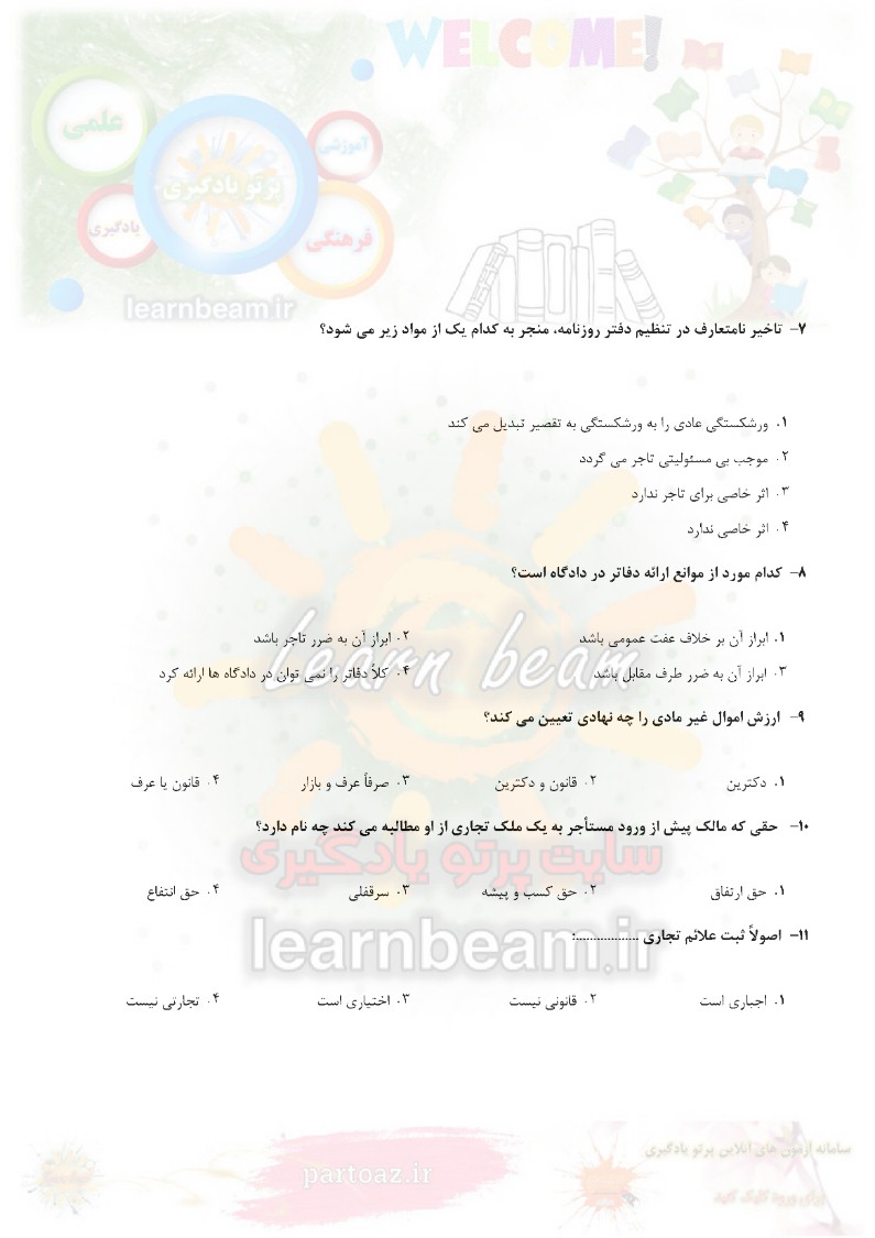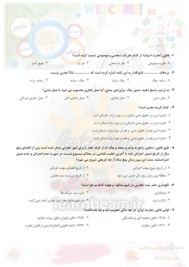 تست حقوق تجارت شامل 150 تست باپاسخ در 33 صفحه در قالب فایل pdf قابل چاپ با کیفیت عالی جهت انسجام ذهنی، خودآزمایی و مطالعه سریع داوطلبین شرکت کننده در آزمون های استخدامی دستگاه های اجرایی مطابق با دفترچه راهنمای ثبت نام و مطابق با سرفصل های اعلام شده در دفترچه راهنمای ثبت نام می باشد