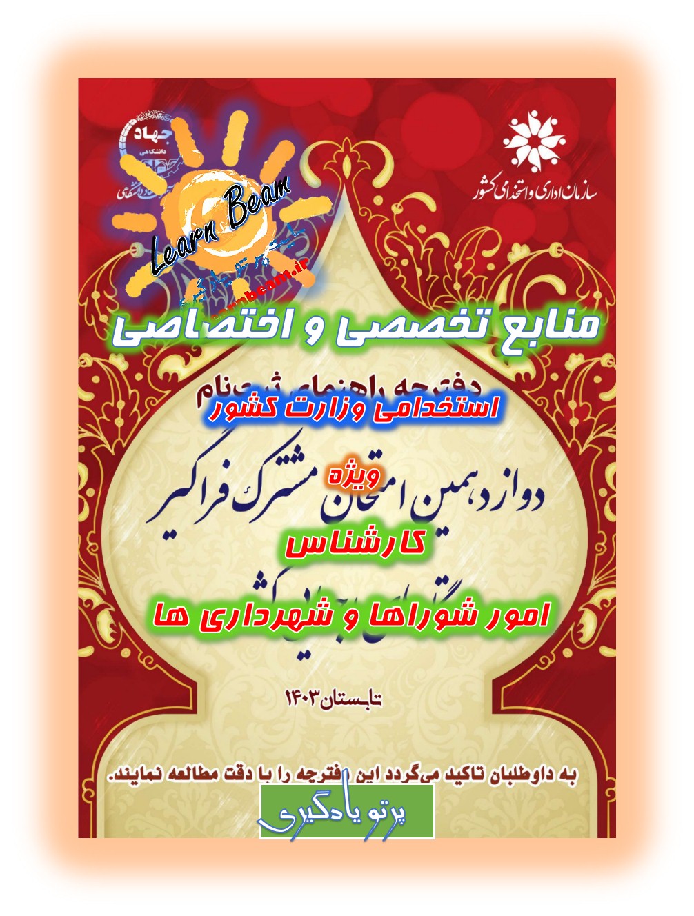 منابع تخصصی و اختصاصی کارشناس امور شوراها و شهرداری ها وزارت کشور استخدامی وزارت کشور در سال 1403. وزارت کشور در سال 1403 مطابق با منابع دفترچه استخدامی دوازدهمین امتحان مشترک فراگیر دستگاههای اجرایی به منظور تأمین نیروی مورد نیاز و خدمترسانی شایسته به هموطنان، برای تصدی عنوان شغلی کارشناس امور شوراها و شهرداری ها افراد واجد شرایط را از طریق برگزاری آزمون کتبی در حیطههای عمومی و تخصصی و اختصاصی، ارزیابی تکمیلی و طی مراحل گزینش بهصورت پیمانی استخدام مینماید. داوطلبان محترم می توانند با تهیه منابع تخصصی و اختصاصی استخدامی کارشناس امور شوراها و شهرداری ها برای آزمون استخدامی این وزارتخانه که روز جمعه مورخ 12مردادماه ۱۴۰3 برگزار خواهد شد خود را آماده و توانمند نمایند. تلاش گروه پرتو یادگیری با تهیه پک کامل این آزمون استخدامی، راحتی و دستیابی عادلانه همه داوطلبین این آزمون استخدامی به منابع کامل می باشد. ضمن آرزوی موفقیت برای یکایک عزیزان در آزمون استخدامی پیش رو.