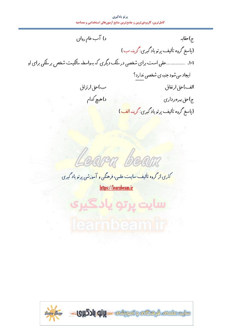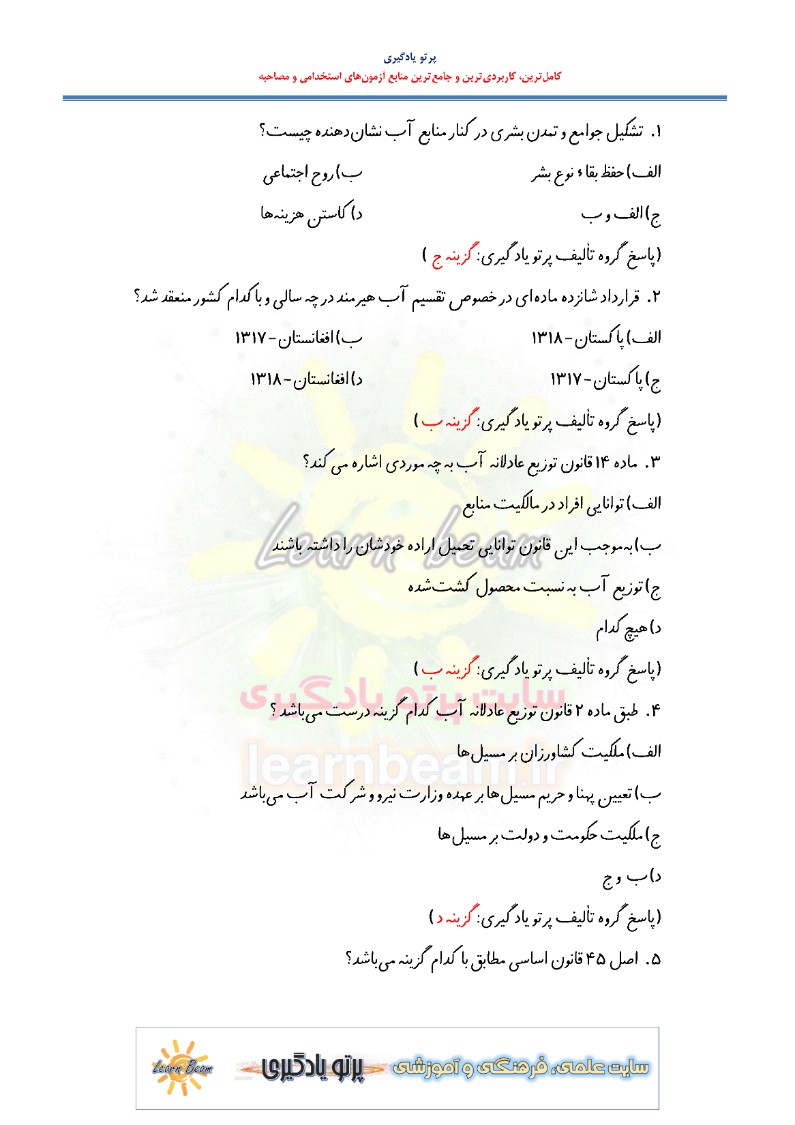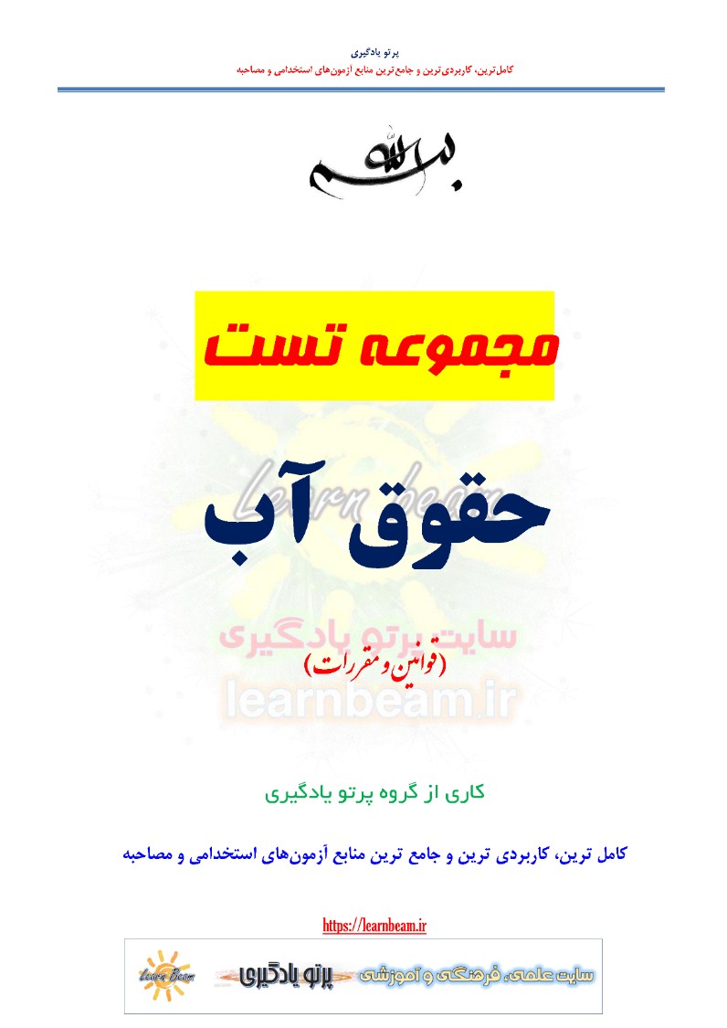 تست حقوق آب (قوانین و مقررات) شامل 101 تست باپاسخ در 24 صفحه در قالب فایل pdf قابل چاپ با کیفیت عالی جهت انسجام ذهنی، خودآزمایی و مطالعه سریع داوطلبین شرکت کننده در دوازدهمین امتحان مشترک فراگیر دستگاه های اجرایی کشور و استخدامی شرکت مدیریت منابع آب ایران و شرکت های تابعه مطابق با دفترچه ثبت نام و مطابق با سرفصل های اعلام شده در دفترچه راهنمای ثبت نام منابع تخصصی و اختصاصی کارشناس بهره برداری و نگهداری سازه های آبی می باشد.