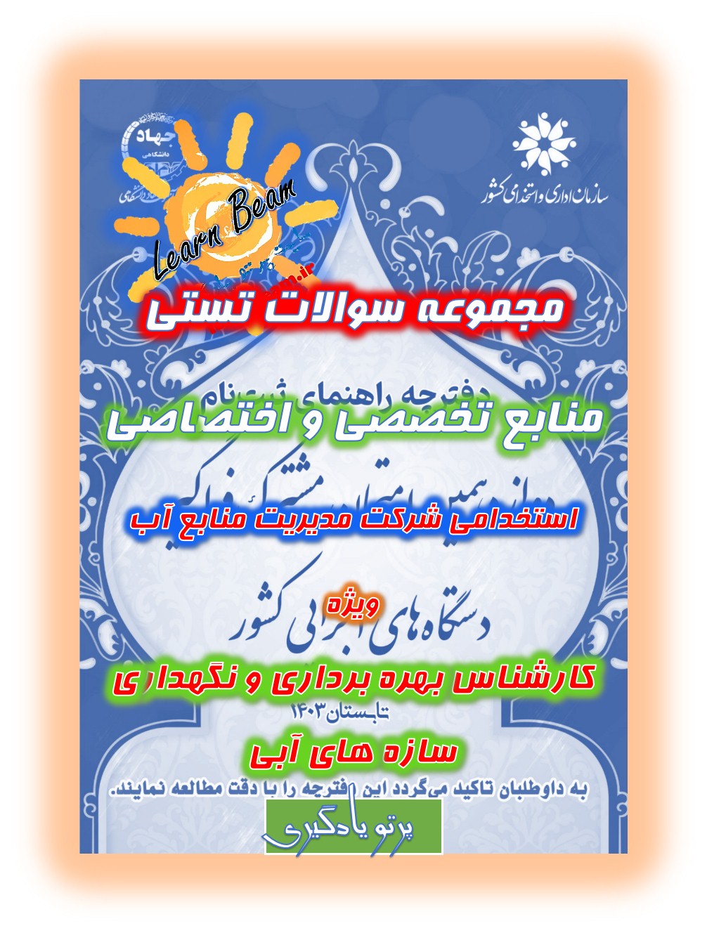 تست منابع تخصصی و اختصاصی کارشناس بهره برداری و نگهداری سازه های آبی شرکت مدیریت منابع آب ایران و شرکت های تابعه استخدامی شرکت مدیریت منابع آب ایران سال 1403. شرکت مدیریت منابع آب ایران در سال 1403 مطابق با منابع دفترچه استخدامی دوازدهمین امتحان مشترک فراگیر دستگاههای اجرایی به منظور تأمین نیروی مورد نیاز و خدمترسانی شایسته به هموطنان، برای تصدی عنوان شغلی کارشناس بهره برداری و نگهداری سازه های آبی افراد واجد شرایط را از طریق برگزاری آزمون کتبی در حیطههای عمومی و تخصصی و اختصاصی، ارزیابی تکمیلی و طی مراحل گزینش بهصورت پیمانی استخدام مینماید. داوطلبان محترم می توانند با تهیه پک سوالات تستی منابع تخصصی و اختصاصی استخدامی کارشناس بهره برداری و نگهداری سازه های آبی برای آزمون استخدامی این وزارتخانه که روز جمعه مورخ 12مردادماه ۱۴۰3 برگزار خواهد شد خود را آماده و توانمند نمایند. تلاش گروه پرتو یادگیری با تهیه پک سوالات تستی کامل این آزمون استخدامی، راحتی و دستیابی عادلانه همه داوطلبین این آزمون استخدامی به منابع کامل می باشد.ضمن آرزوی موفقیت برای یکایک عزیزان در آزمون استخدامی پیش رو.