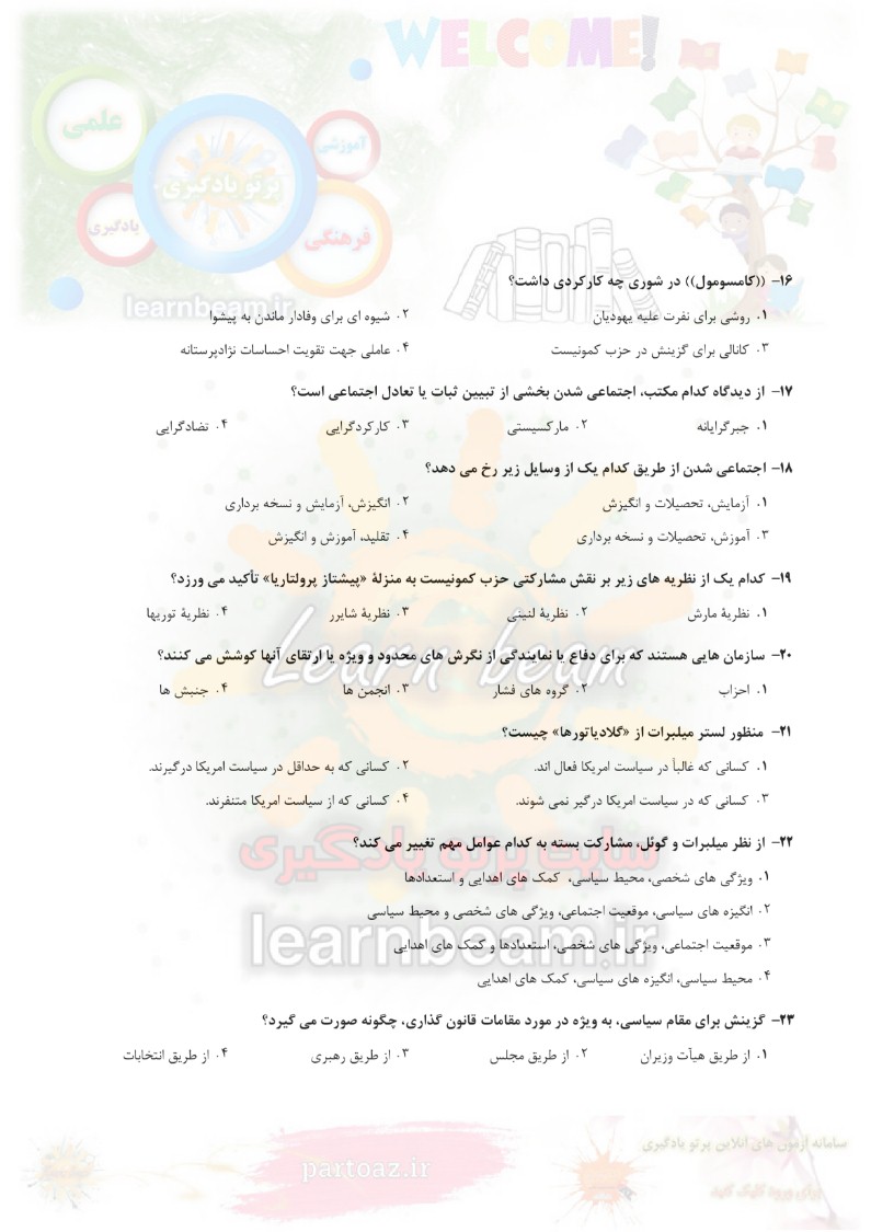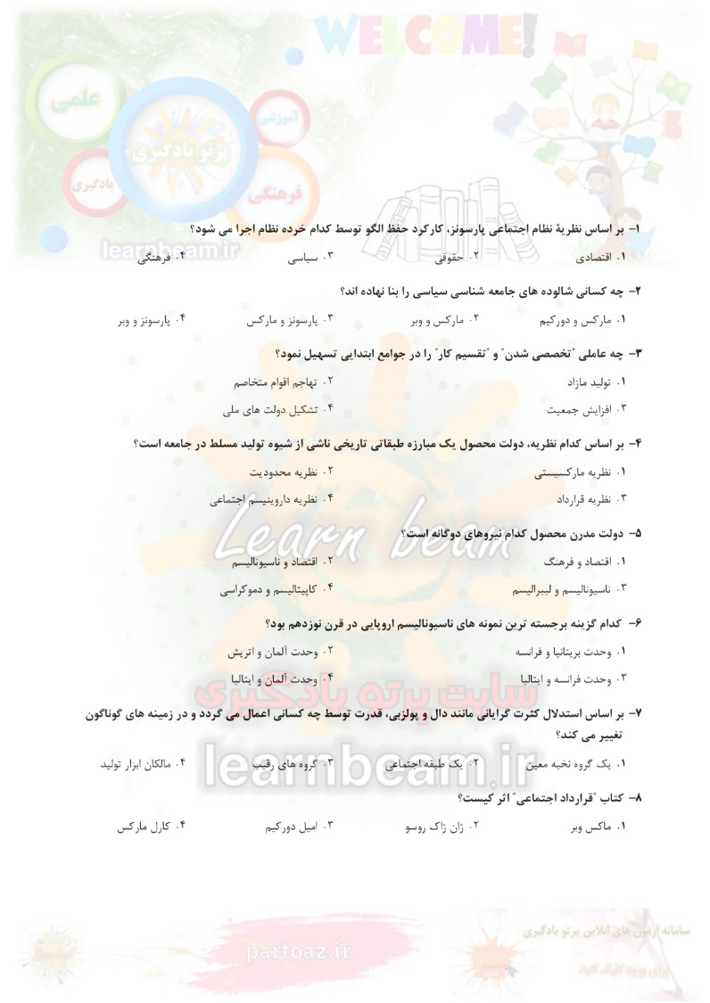 تست جامعه شناسی سیاسی مجموعه سولات تستی جامعه شناسی سیاسی شامل 550 سوال تستی باپاسخ در 54 صفحه در قالب فایل pdf می باشد. مجموعه سوالات تستی جامعه شناسی سیاسی قابل چاپ با کیفیت عالی جهت انسجام ذهنی، خودآزمایی و مطالعه سریع داوطلبین شرکت کننده در دوازدهمین امتحان مشترک فراگیر دستگاه های اجرایی کشور و استخدامی دستگاه های اجرایی در سال 1403 مطابق با دفترچه راهنمای ثبت نام آزمون و اصلاحیه نهایی می باشد.