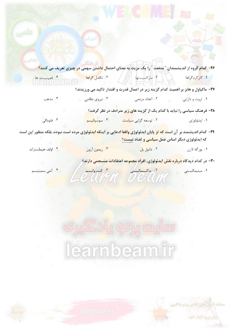 تست جامعه شناسی سیاسی شامل 550 تست باپاسخ در 54 صفحه در قالب فایل pdf قابل چاپ با کیفیت عالی جهت انسجام ذهنی، خودآزمایی و مطالعه سریع داوطلبین شرکت کننده در دوازدهمین امتحان مشترک فراگیر دستگاه های اجرایی کشور و استخدامی دستگاه های اجرایی مطابق با دفترچه ثبت نام و مطابق با سرفصل های اعلام شده در دفترچه راهنمای ثبت نام می باشد.