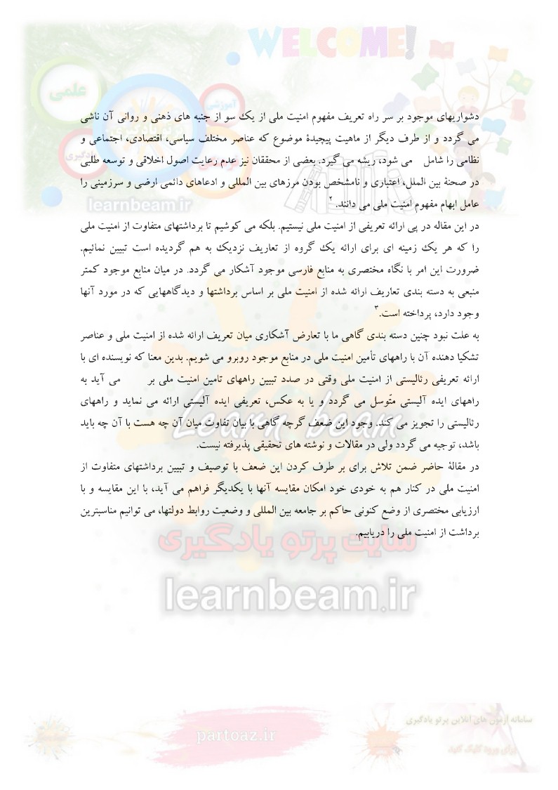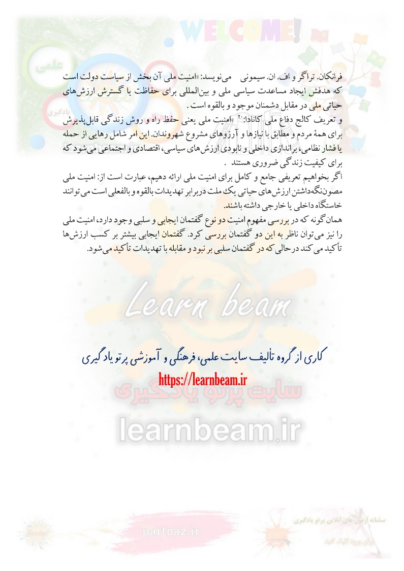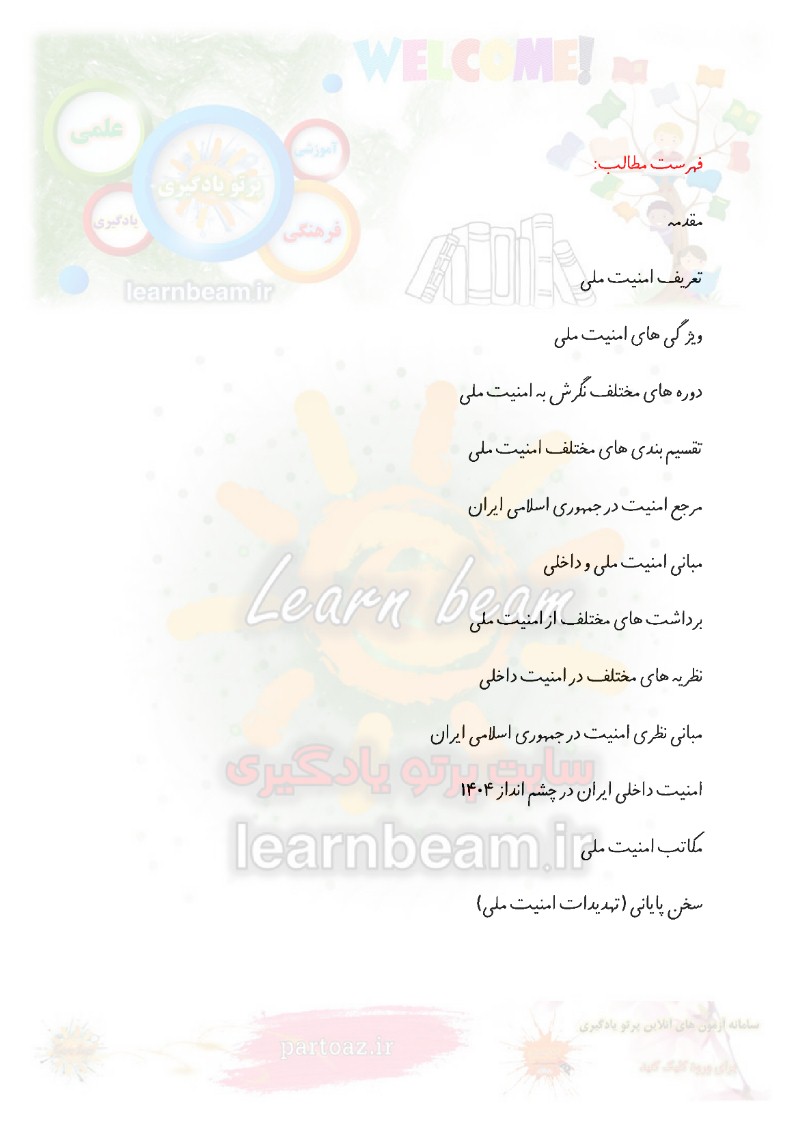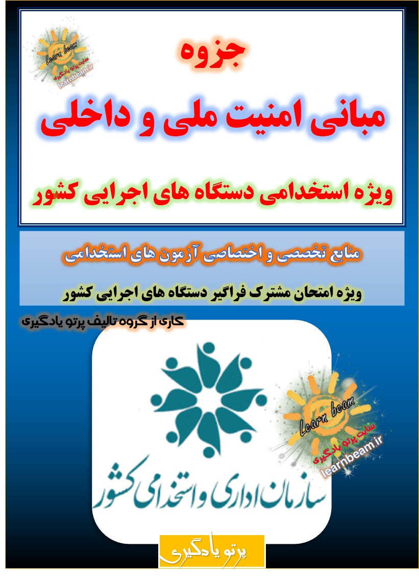 جزوه مبانی امنیت ملی و داخلی در 153 صفحه در قالب فایل pdf قابل چاپ با کیفیت عالی جهت انسجام ذهنی، خودآزمایی و مطالعه سریع داوطلبین شرکت کننده در دوازدهمین امتحان مشترک فراگیر دستگاه های اجرایی کشور و استخدامی دستگاه های اجرایی مطابق با دفترچه ثبت نام و مطابق با سرفصل های اعلام شده در دفترچه راهنمای ثبت نام می باشد.