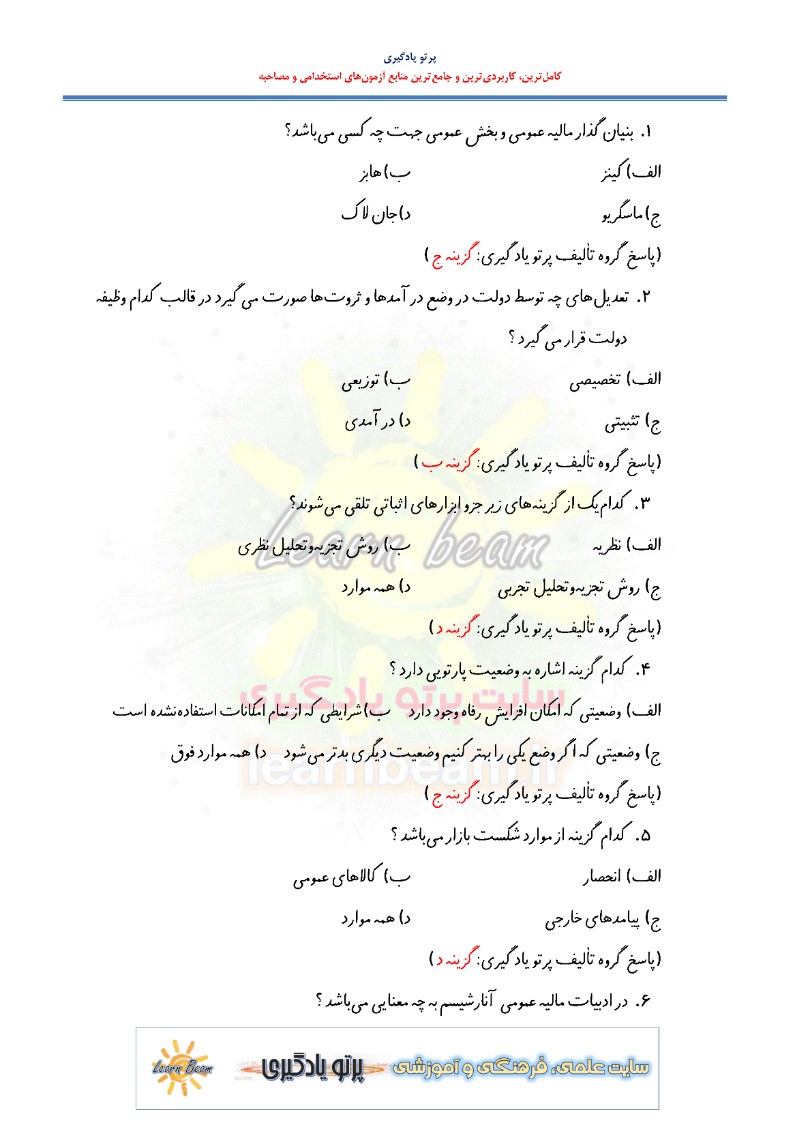 تست مالیه عمومی شامل 150 تست باپاسخ در 33 صفحه در قالب فایل pdf قابل چاپ با کیفیت عالی جهت انسجام ذهنی، خودآزمایی و مطالعه سریع داوطلبین شرکت کننده در دوازدهمین امتحان مشترک فراگیر دستگاه های اجرایی کشور و استخدامی دستگاه های اجرایی مطابق با دفترچه ثبت نام و مطابق با سرفصل های اعلام شده در دفترچه راهنمای ثبت نام می باشد.