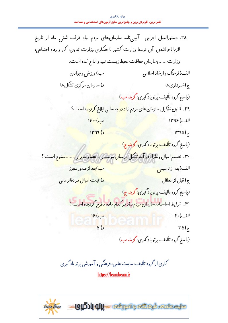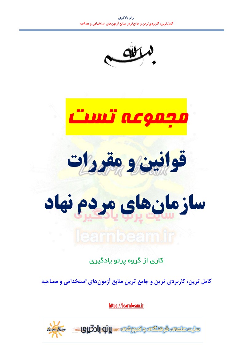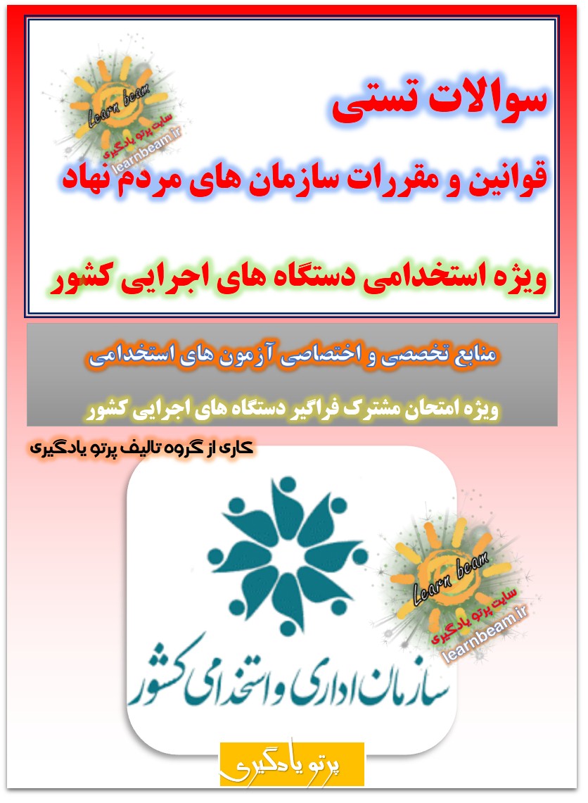 سوالات تستی قوانین و مقررات سازمان های مردم نهاد شامل 31 تست در 8 صفحه به صورت خلاصه در قالب فایل pdf قابل چاپ با کیفیت عالی جهت انسجام ذهنی، خودآزمایی و مطالعه سریع داوطلبین شرکت کننده در دوازدهمین امتحان مشترک فراگیر دستگاه های اجرایی کشور و استخدامی دستگاه های اجرایی مطابق با دفترچه ثبت نام و مطابق با سرفصل های اعلام شده در دفترچه راهنمای ثبت نام می باشد.