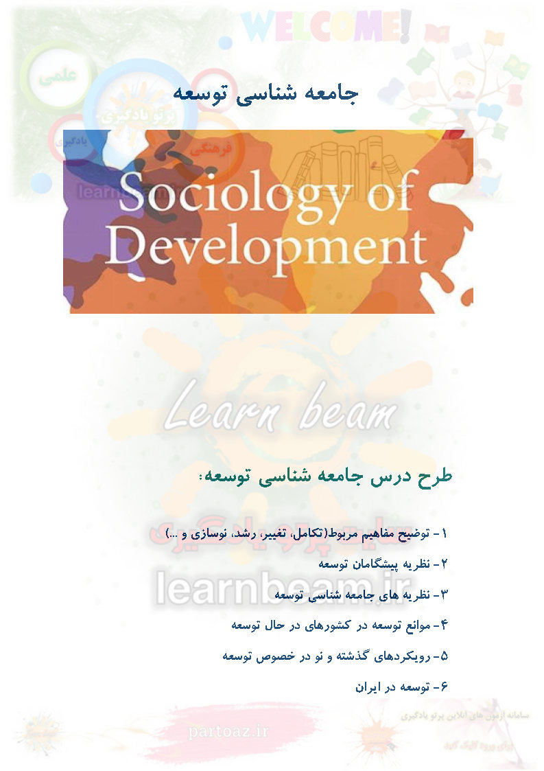 جزوه جامعه شناسی توسعه در 78 صفحه به صورت خلاصه در قالب فایل pdf قابل چاپ با کیفیت عالی جهت انسجام ذهنی، خودآزمایی و مطالعه سریع داوطلبین شرکت کننده در دوازدهمین امتحان مشترک فراگیر دستگاه های اجرایی کشور و استخدامی دستگاه های اجرایی مطابق با دفترچه ثبت نام و مطابق با سرفصل های اعلام شده در دفترچه راهنمای ثبت نام می باشد.