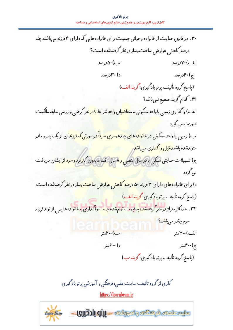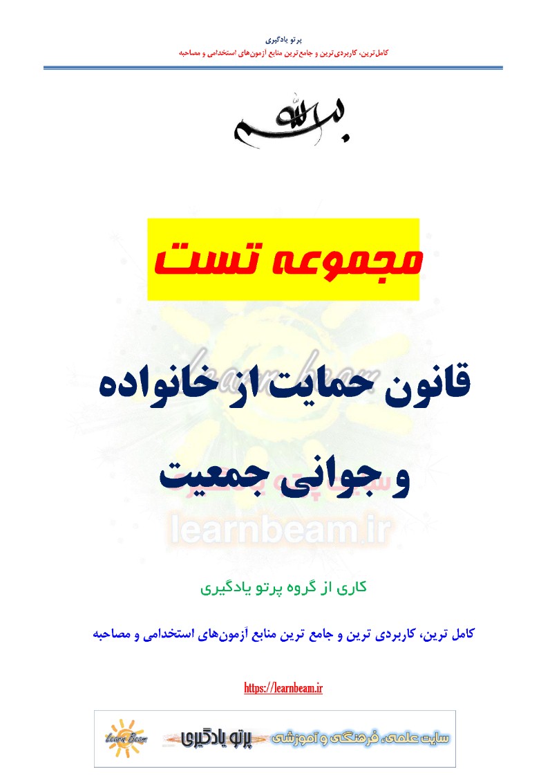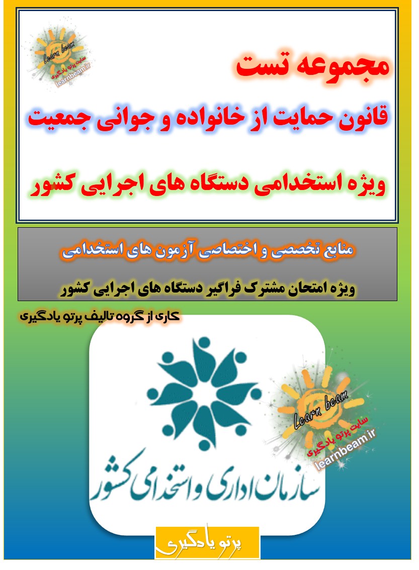 تست قانون حمایت از خانواده و جوانی جمعیت شامل 32 تست باپاسخ در 11 صفحه در قالب فایل pdf قابل چاپ با کیفیت عالی جهت انسجام ذهنی، خودآزمایی و مطالعه سریع داوطلبین شرکت کننده در دوازدهمین امتحان مشترک فراگیر دستگاه های اجرایی کشور و استخدامی دستگاه های اجرایی مطابق با دفترچه ثبت نام و مطابق با سرفصل های اعلام شده در دفترچه راهنمای ثبت نام می باشد.