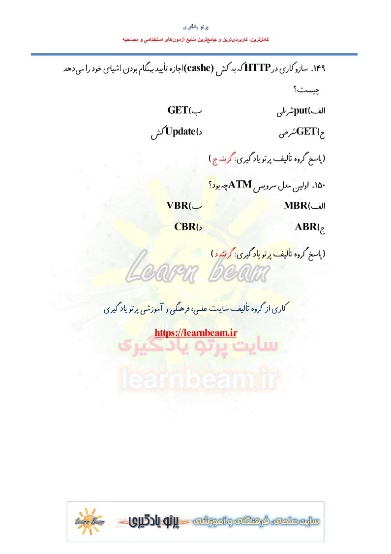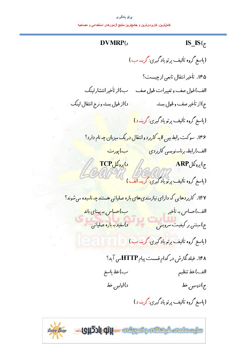 تست شبکه های کامپیوتری شامل 150 تست باپاسخ در 38 صفحه در قالب فایل pdf قابل چاپ با کیفیت عالی جهت انسجام ذهنی، خودآزمایی و مطالعه سریع داوطلبین شرکت کننده در دوازدهمین امتحان مشترک فراگیر دستگاه های اجرایی کشور و استخدامی دستگاه های اجرایی مطابق با دفترچه ثبت نام و مطابق با سرفصل های اعلام شده در دفترچه راهنمای ثبت نام می باشد.