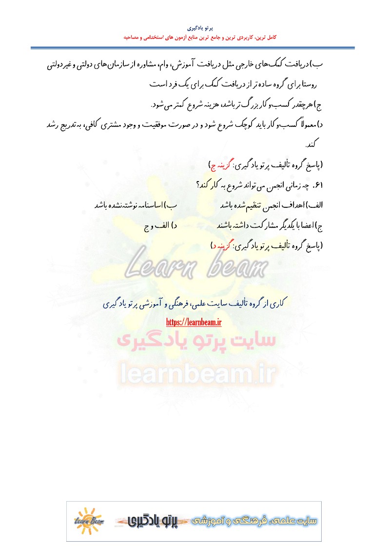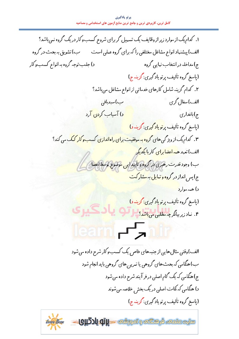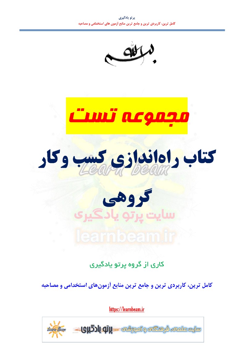 تست کتاب راه اندازی کسب و کار گروهی شامل 61 تست باپاسخ در 16 صفحه در قالب فایل pdf قابل چاپ با کیفیت عالی جهت انسجام ذهنی، خودآزمایی و مطالعه سریع داوطلبین شرکت کننده در استخدامی آزمون تسهیلگران شغلی بهزیستی و سایر آزمون های مرتبط مطابق با دفترچه ثبت نام و مطابق با سرفصل های اعلام شده در دفترچه راهنمای ثبت نام می باشد.