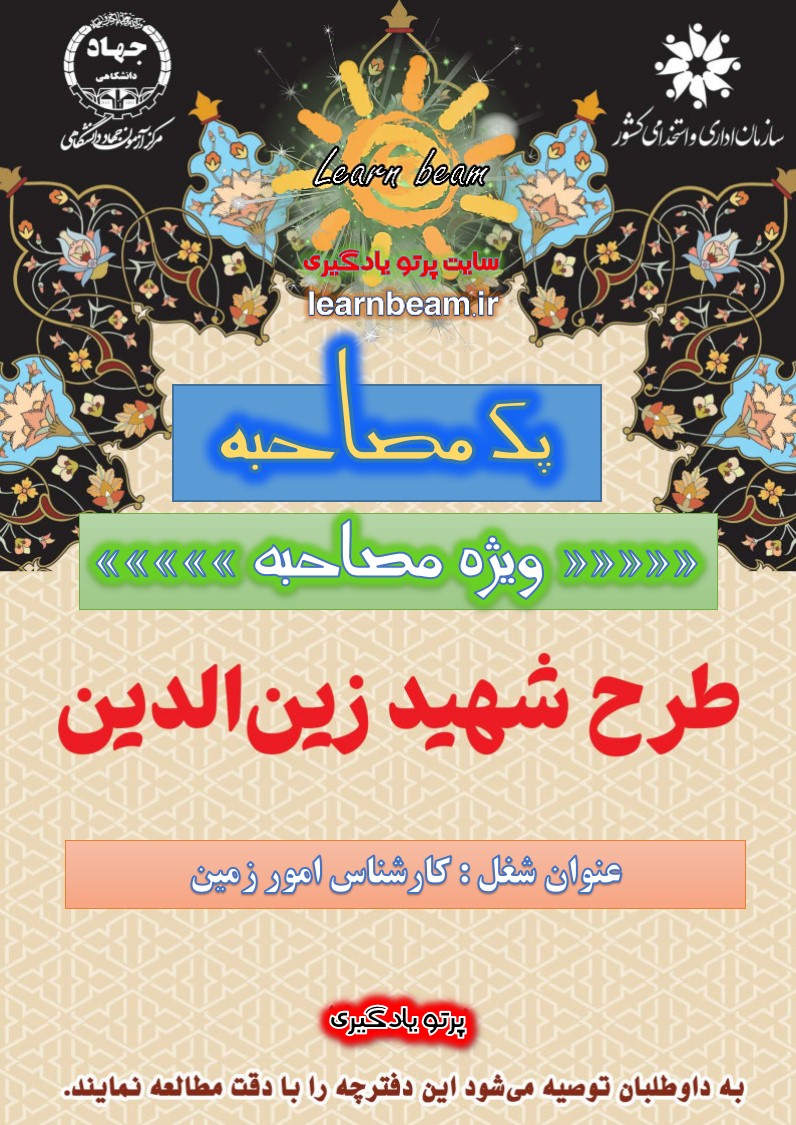 جزوه مصاحبه کارشناس امور زمین طرح شهید زین الدین مجموعه سوالات مصاحبه کارشناس امور زمین طرح شهید زین الدین. جزوه مصاحبه طرح شهید زین الدین با گردآوری مطالب مرتبط و بروز استخدامی طرح شهید زین الدین طبق سرفصل های اعلامی سعی نموده شما را در این مصاحبه استخدامی موفق و پیروز نماید. در مجموعه حاضر مفاهیم حول 0 تا 100 موضوعات زیر می باشد: مسایل و مطالب عمومی در حیطه مصاحبه و آشنایی با فضای مصاحبه و ... در حیطه عمومی و آشنايی با ماموریت های امور زمین در استان در حیطه اختصاصی زراعت عمومی، حقوق کاربردی اراضی در ایران جنگل شناسی و اکولوژی جنگل، ضوابط واگذاری اراضی ملی و دولتی در حیطه تخصصی و مثال های موقعیتی از موقعیت های شغلی نمونه پرسش های احتمالی در جریان مصاحبه مطابق با محور های اعلامی مصاحبه شایستگی محور و مثال های عینی در حیطه محورهای اعلامی. تلاش گروه پرتو یادگیری با تهیه پک کامل این مصاحبه استخدامی راحتی و دستیابی عادلانه همه داوطلبین این فرایند استخدامی به منابع کامل می باشد.