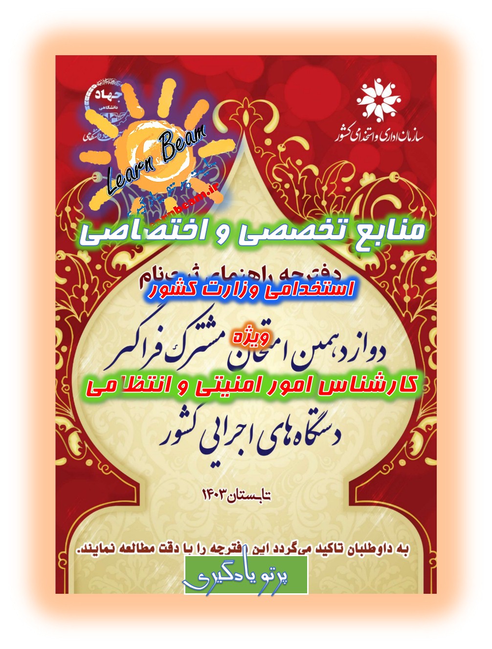 منابع تخصصی و اختصاصی کارشناس امور امنیتی و انتظامی وزارت کشور استخدامی وزارت کشور در سال 1403. وزارت کشور در سال 1403 مطابق با منابع دفترچه استخدامی دوازدهمین امتحان مشترک فراگیر دستگاههای اجرایی به منظور تأمین نیروی مورد نیاز و خدمترسانی شایسته به هموطنان، برای تصدی عنوان شغلی کارشناس امور امنیتی و انتظامی افراد واجد شرایط را از طریق برگزاری آزمون کتبی در حیطههای عمومی و تخصصی و اختصاصی، ارزیابی تکمیلی و طی مراحل گزینش بهصورت پیمانی استخدام مینماید. داوطلبان محترم می توانند با تهیه منابع تخصصی و اختصاصی استخدامی کارشناس امور امنیتی و انتظامی برای آزمون استخدامی این وزارتخانه خود را آماده و توانمند نمایند. تلاش گروه پرتو یادگیری با تهیه پک کامل این آزمون استخدامی، راحتی و دستیابی عادلانه همه داوطلبین این آزمون استخدامی به منابع کامل می باشد. ضمن آرزوی موفقیت برای یکایک عزیزان در آزمون استخدامی پیش رو.