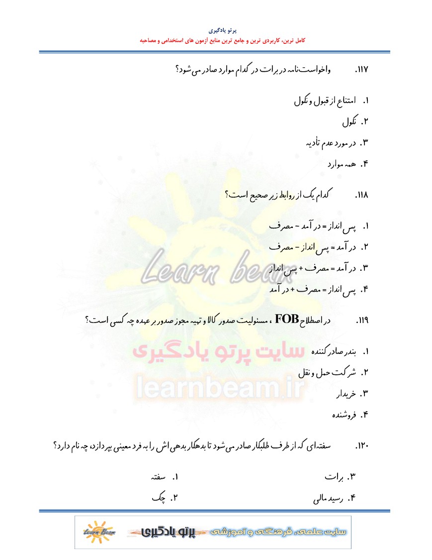 دانلود سوالات تستی بانکداری داخلی جزوه سوالات تستی بانکداری داخلی با پاسخنامه آزمون استخدامی بانک ها شرکت کنندگان در آزمون استخدامی را در مرور سریع مفاهیم و موضوعات آماده نموده و یاری رسان خواهد بود . تست بانکداری داخلی می تواند داوطلبین آزمون استخدامی بانک ها را برای آزمون پیش رو آماده نماید. داوطلبین عزیز می توانند با تهیه، دانلود و مطالعه سوالات تستی بانکداری داخلی بهتر از سایر شرکت کنندگان در آزمون استخدامی بانک ها عمل نمایند.