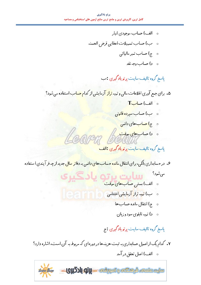 دانلود سوالات تستی حسابداری بانکی جزوه سوالات تستی حسابداری بانکی آزمون استخدامی بانک ها شرکت کنندگان در آزمون استخدامی را در مرور سریع مفاهیم و موضوعات آماده نموده و یاری رسان خواهد بود . تست حسابداری بانکی می تواند داوطلبین آزمون استخدامی بانک ها را برای آزمون پیش رو آماده نماید. داوطلبین عزیز می توانند با تهیه، دانلود و مطالعه سوالات تستی حسابداری بانکی بهتر از سایر شرکت کنندگان در آزمون استخدامی بانک ها عمل نمایند.