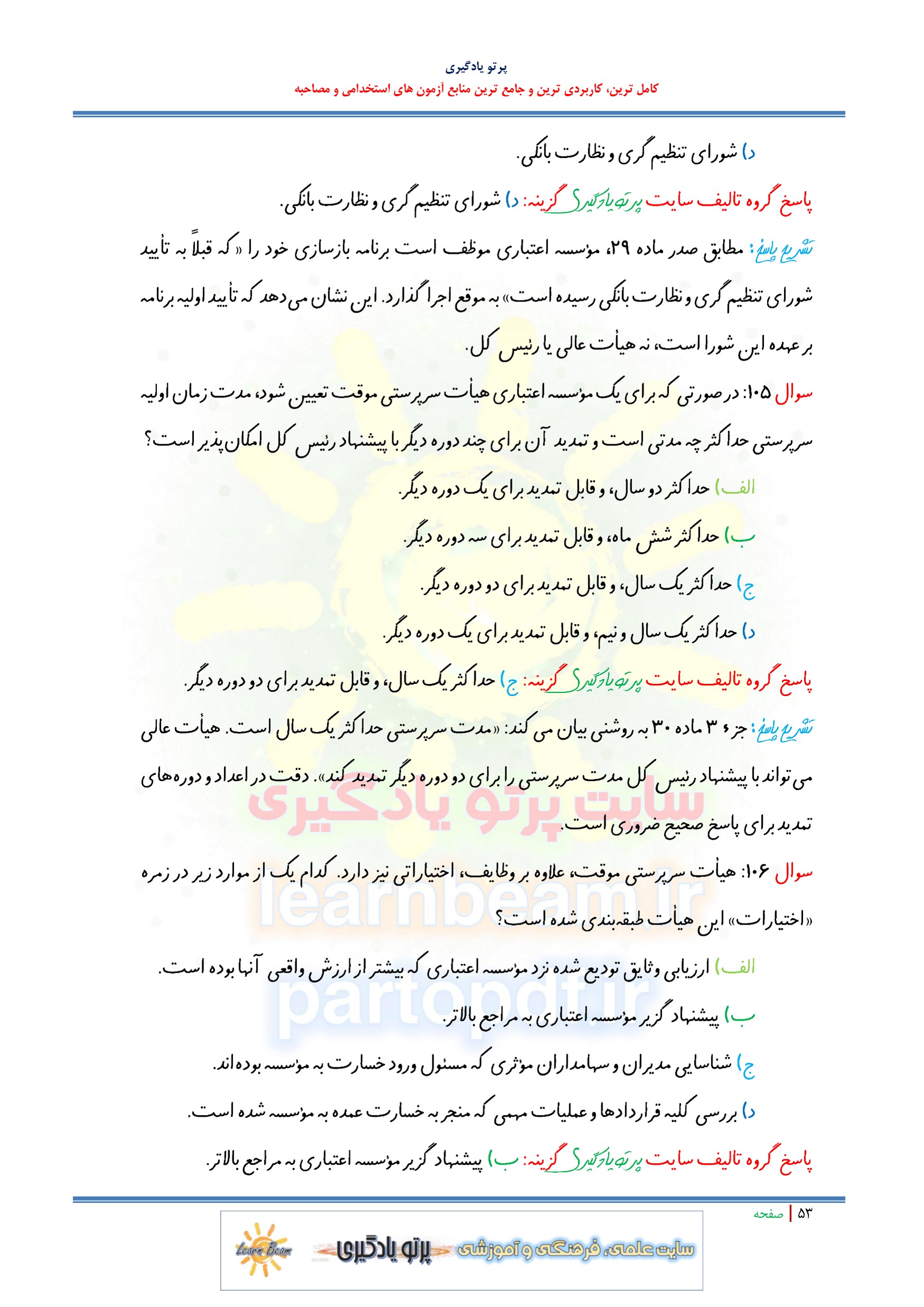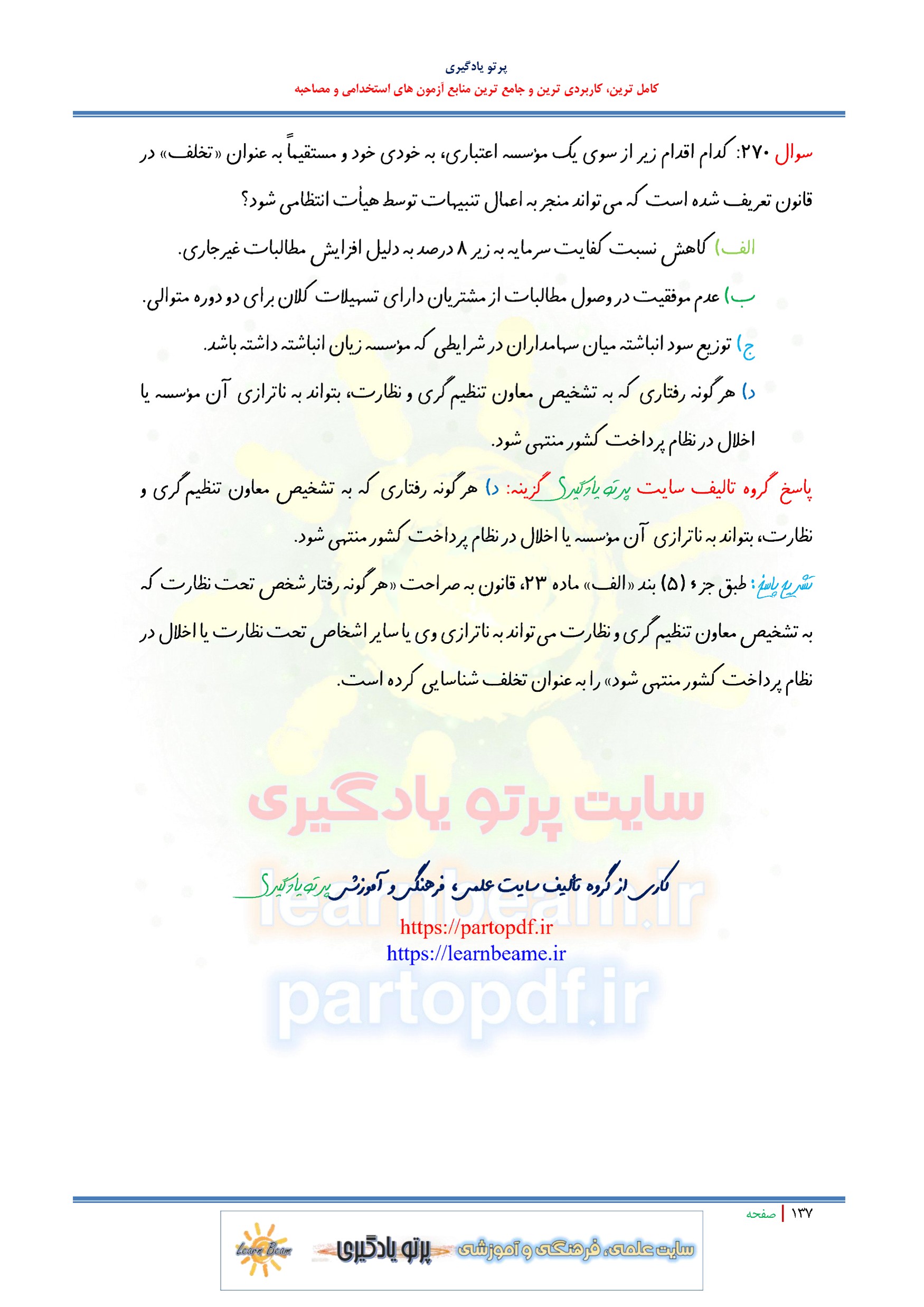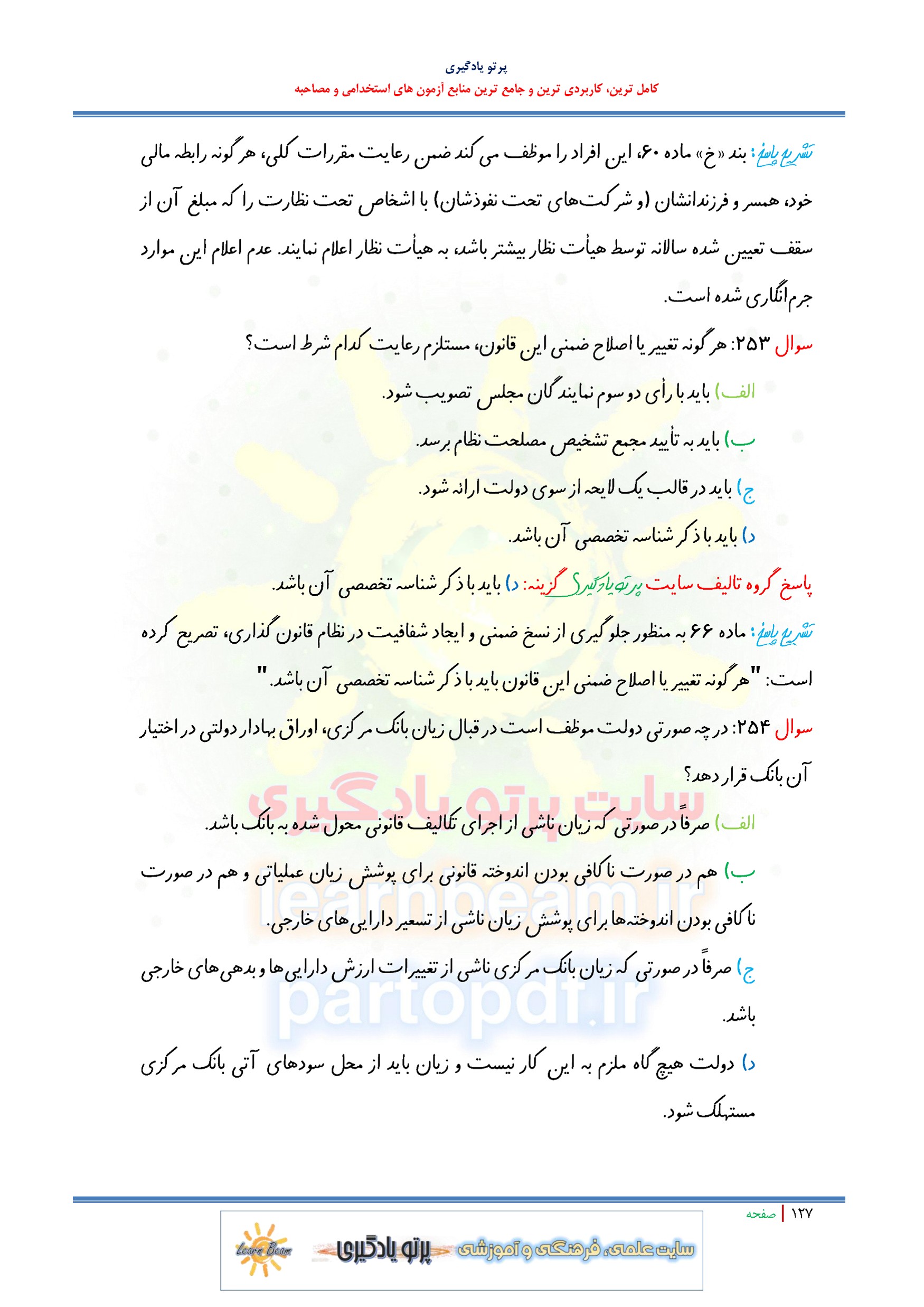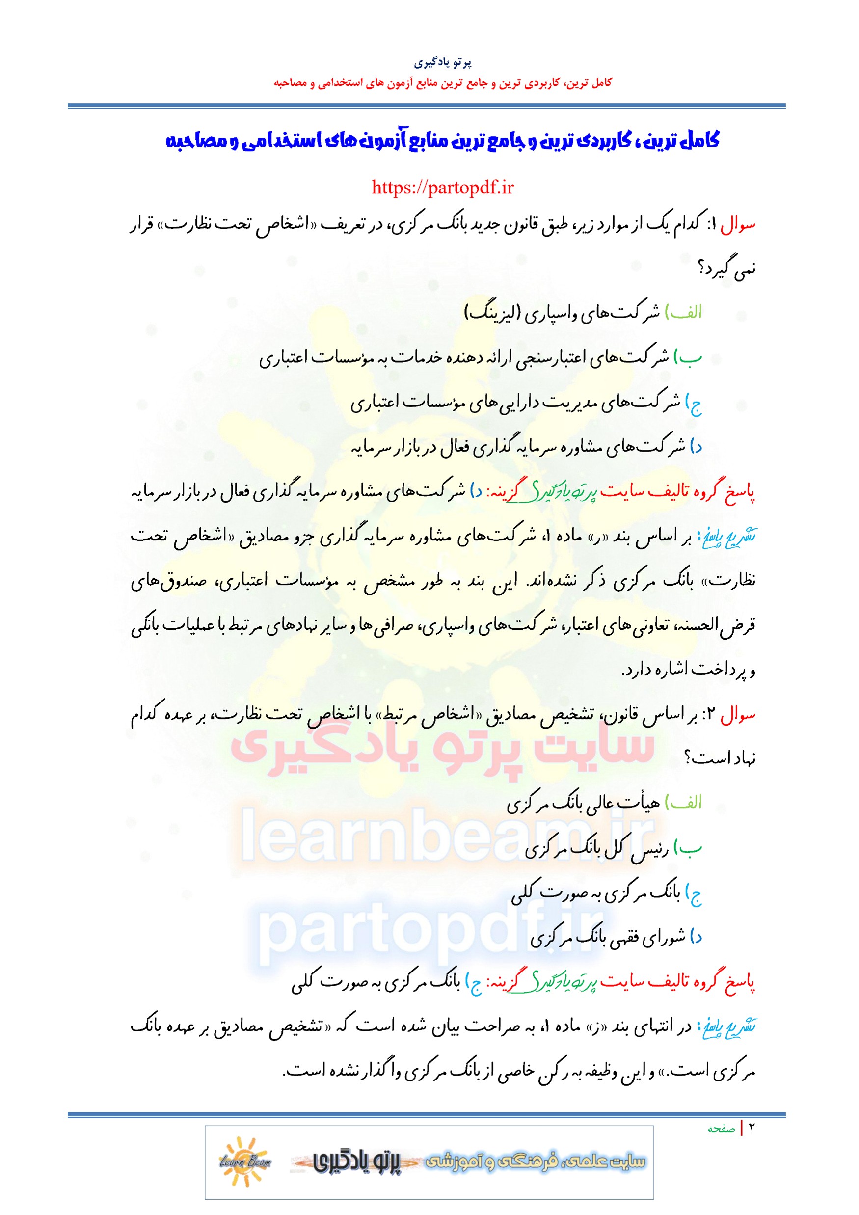 تست قانون بانک مرکزی جمهوری اسلامی ایران مجموعه سوالات تستی قانون بانک مرکزی جمهوری اسلامی ایران با پاسخ تشریحی شامل 270 سوال تستی در 137 صفحه به صورت pdf جزوه سوال تستی قانون بانک مرکزی جمهوری اسلامی ایران با پاسخ تشریحی. مجموعه سوالات تستی قانون بانک مرکزی جمهوری اسلامی ایران شرکت کنندگان در آزمون استخدامی بانک ها را در مرور سریع کمک کرده و آن ها را یاری رسان خواهد بود.