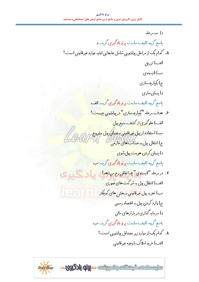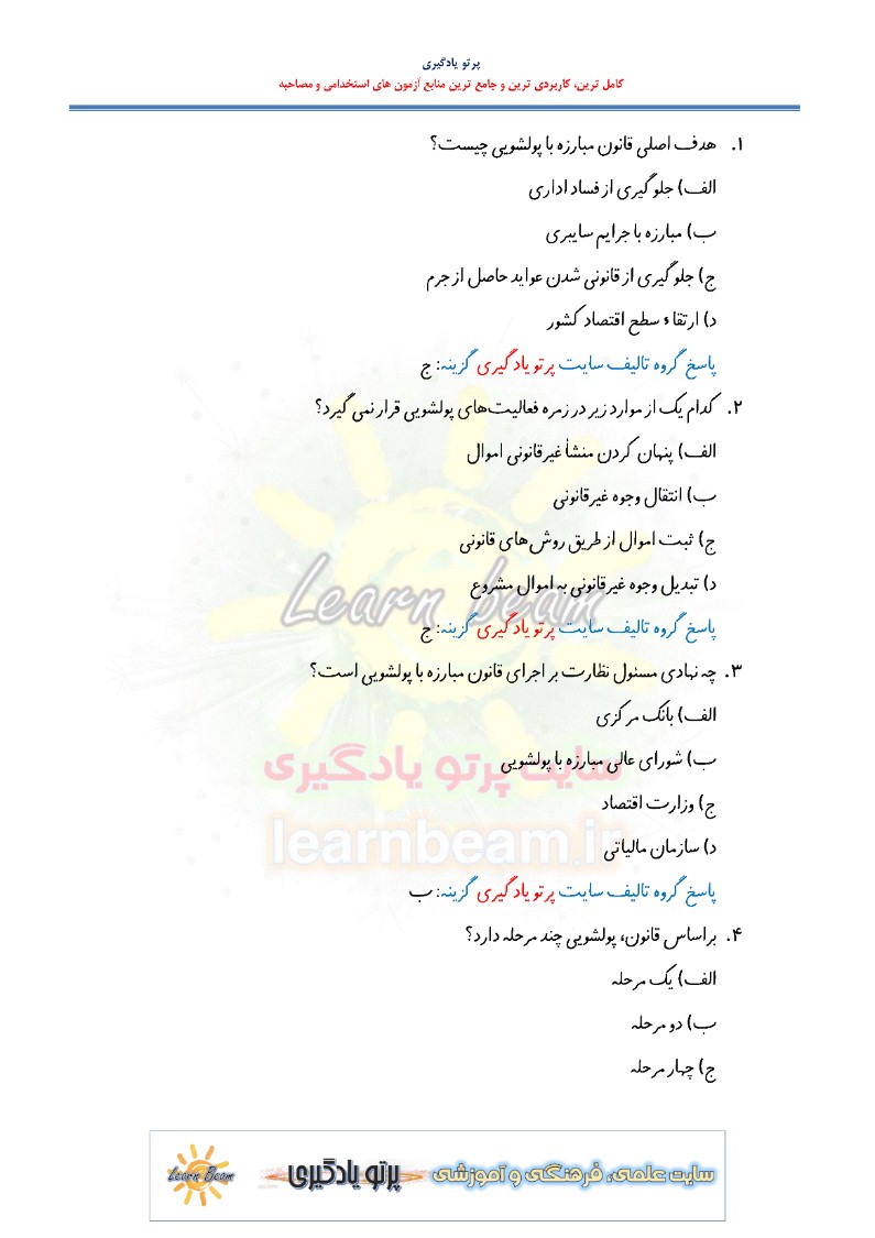 تست قانون مبارزه با پولشویی مجموعه سوالات تستی قانون مبارزه با پولشویی آزمون استخدامی بانک ها شامل 73 سوال تستی در 22 صفحه به صورت pdf جزوه سوال تستی قانون مبارزه با پولشویی با پاسخنامه. مجموعه سوالات تستی قانون مبارزه با پولشویی شرکت کنندگان در آزمون استخدامی بانک ها را در مرور سریع کمک کرده و آن ها را یاری رسان خواهد بود.