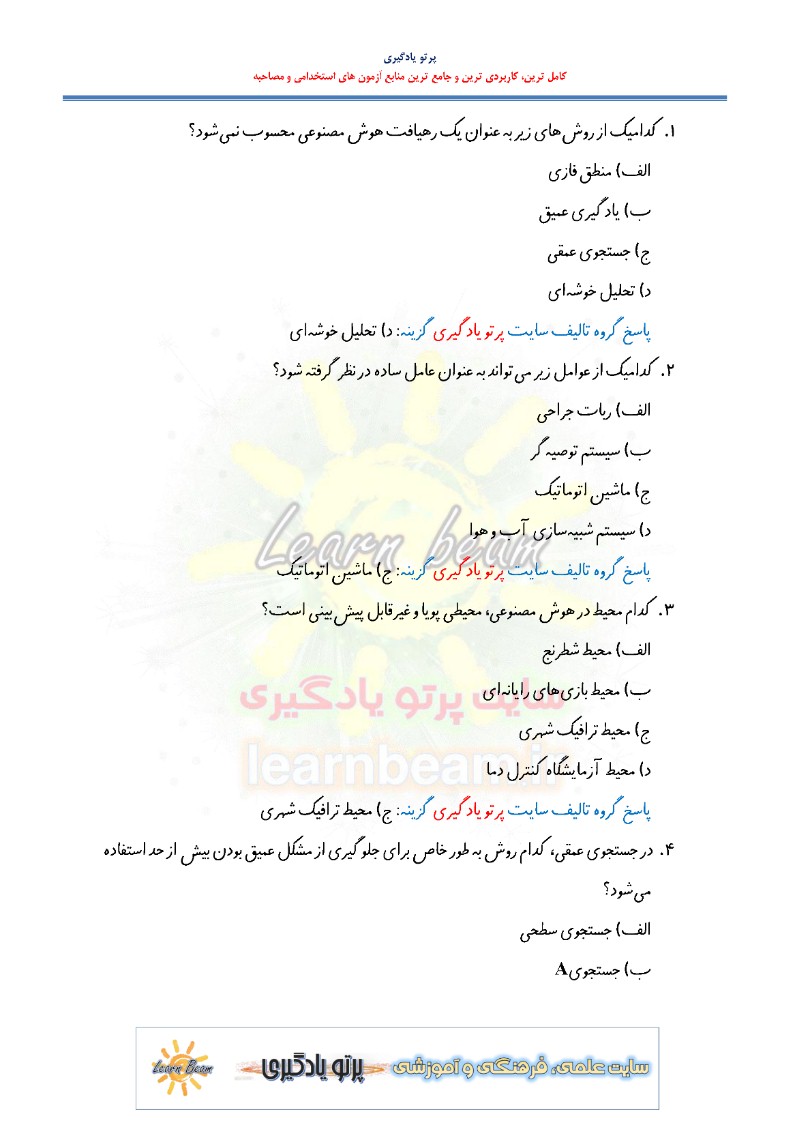 تست هوش مصنوعی مجموعه سوالات تستی هوش مصنوعی آزمون استخدامی بانک ها شامل 301 سوال تستی در 95 صفحه به صورت pdf جزوه سوال تستی هوش مصنوعی با پاسخنامه. مجموعه سوالات تستی هوش مصنوعی شرکت کنندگان در آزمون استخدامی بانک ها را در مرور سریع کمک کرده و آن ها را یاری رسان خواهد بود.