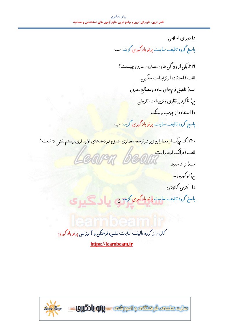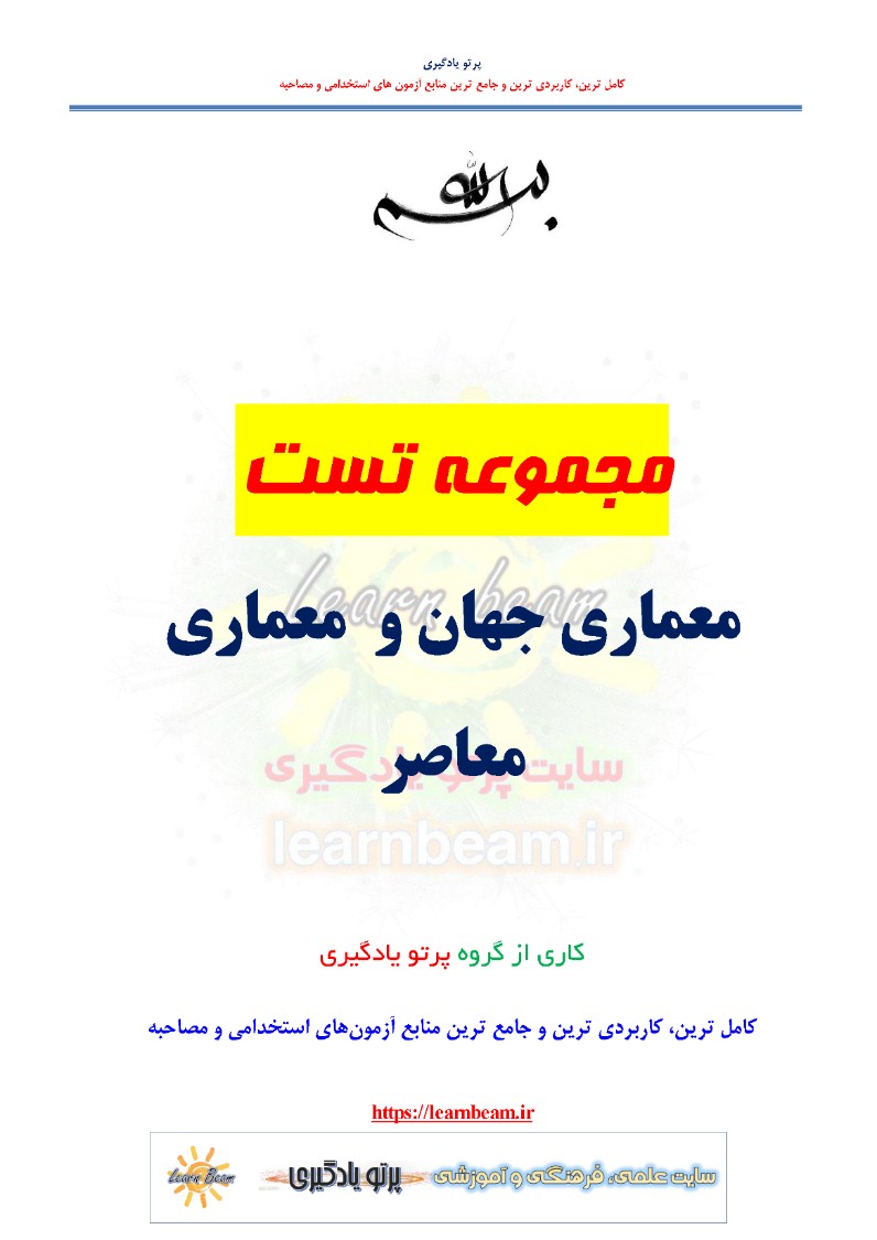 تست معماری جهان و معماری معاصر (منابع تخصصی استخدامی) مجموعه سوالات تستی معماری جهان و معماری معاصر شامل 220 سوال تستی در 68 صفحه به صورت pdf جزوه سوال تستی معماری جهان و معماری معاصر با پاسخنامه. مجموعه سوالات تستی معماری جهان و معماری معاصر شرکت کنندگان در آزمون های استخدامی را در مرور سریع کمک کرده و آن ها را یاری رسان خواهد بود.