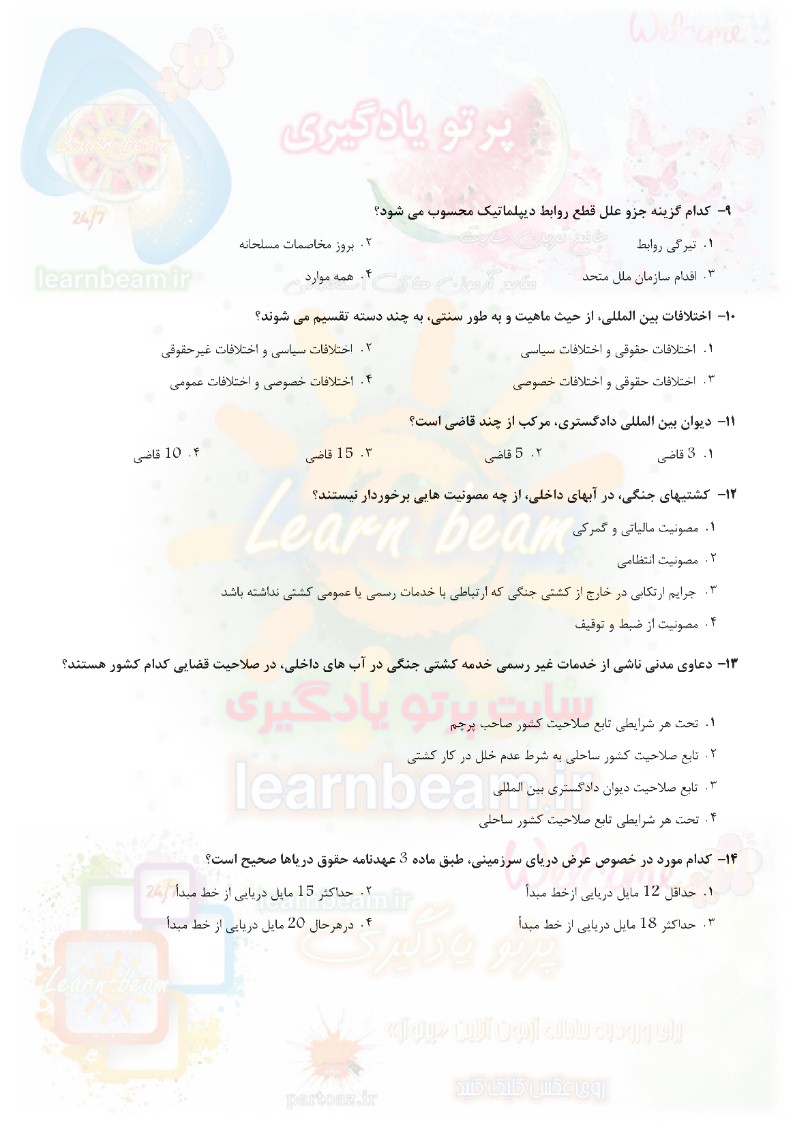 تست حقوق بین الملل سوالات تستی کتاب حقوق بین الملل مجموعه سوالات تستی حقوق بین الملل شامل 150 سوال تستی در 31 صفحه در قالب فایل pdf. جهت آشنایی داوطلبین با نکات کلیدی حقوق بین الملل و جهت تجمیع و سازماندهی ذهنی و آمادگی برای آزمون های استخدامی پیش رو. تهیه و مطالعه جزوه سوالات تستی حقوق بین الملل به داوطلبین عزیز پیشنهاد می گردد.