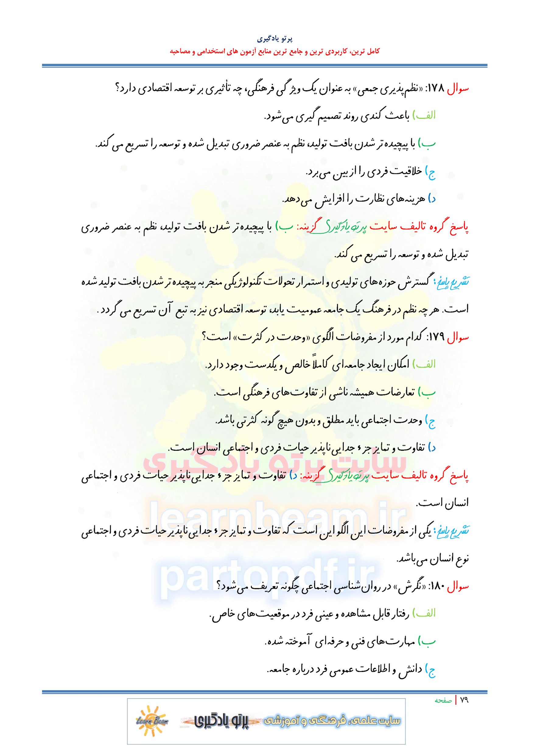 سوالات و تست مدیریت سازمان های فرهنگی. سوالات تستیمدیریت سازمان های فرهنگی شامل 270 سوال تستی در 117 صفحه با پاسخ تشریحی در قالب فایل pdf. مطابق با سرفصل های دفترچه آزمون های استخدامی. مجموعه سوالات تستی مدیریت سازمان های فرهنگی بهترین منبع برای آمادگی آزمون های استخدامی می باشد. مجموعه سوالات و تست مدیریت سازمان های فرهنگی مطالب خوانده شده داوطلبین آزمون استخدامی را نظم بخشیده و منسجم می سازد. مجموعه سوالات و تستمدیریت سازمان های فرهنگی ویژه آزمون های استخدامی مرور سریع داوطلب را سبب می شود و آگاهی های وی را نظم بخشیده و یک آمادگی و شبیه سازی را برای جلسه آزمون به همراه دارد. مطالعه پک مجموعه سوالات و تستمدیریت سازمان های فرهنگی برای داوطلبین آزمون های استخدامی پیشنهاد می شود.