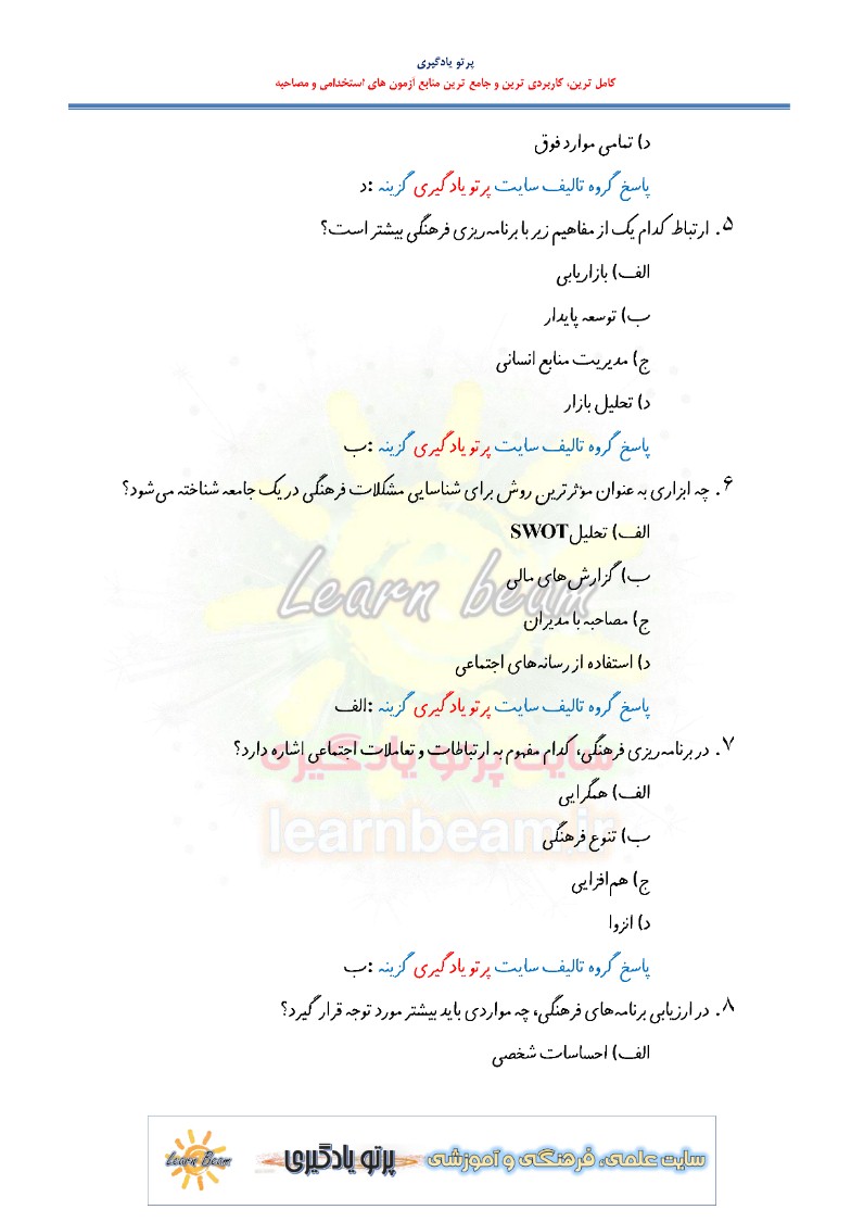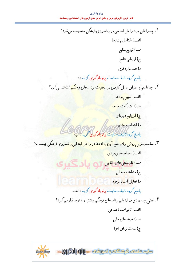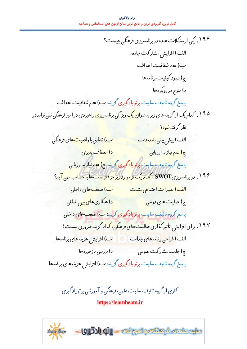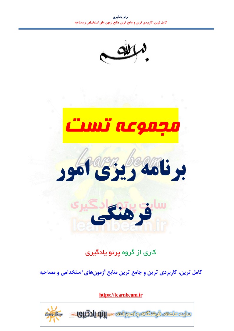 سوالات تستی برنامه ریزی امور فرهنگی شامل 197 تست در 57 صفحه در قالب فایل pdf قابل چاپ با کیفیت عالی جهت انسجام ذهنی، خودآزمایی و مطالعه سریع داوطلبین شرکت کننده در آزمون های استخدامی و دوازدهمین امتحان مشترک فراگیر دستگاه های اجرایی کشور و استخدامی دستگاه های اجرایی مطابق با دفترچه ثبت نام و مطابق با سرفصل های اعلام شده در دفترچه راهنمای ثبت نام می باشد.