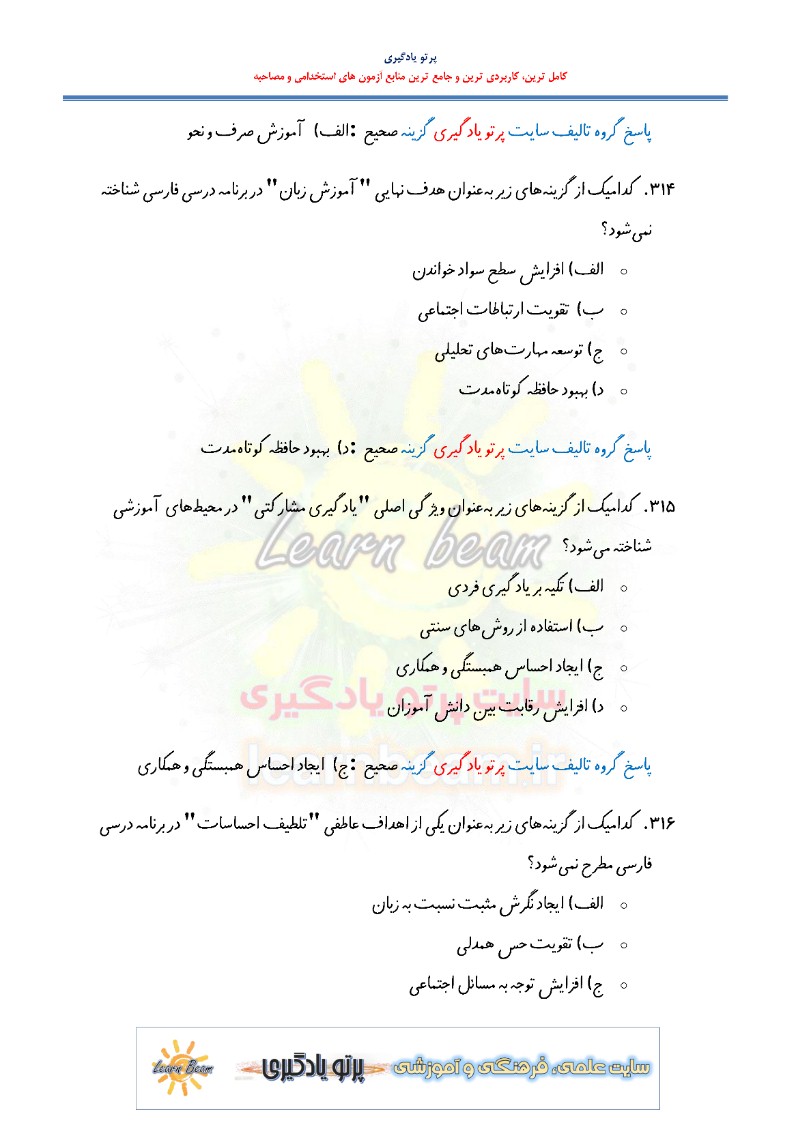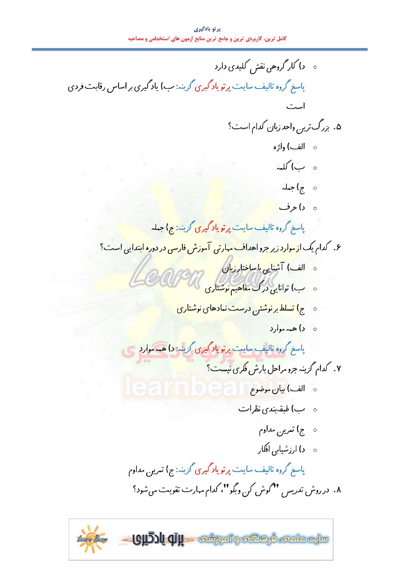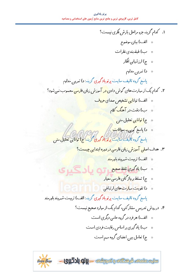 سوالات تستی روش تدریس فارسی دوره ابتدایی