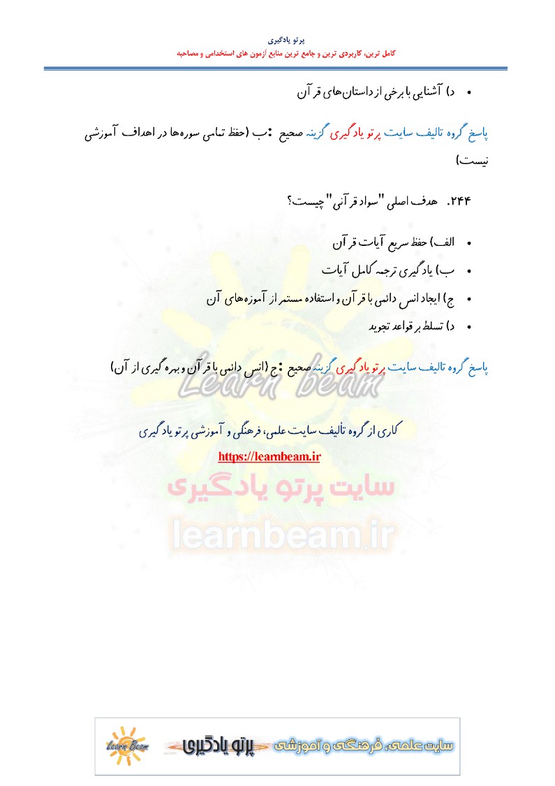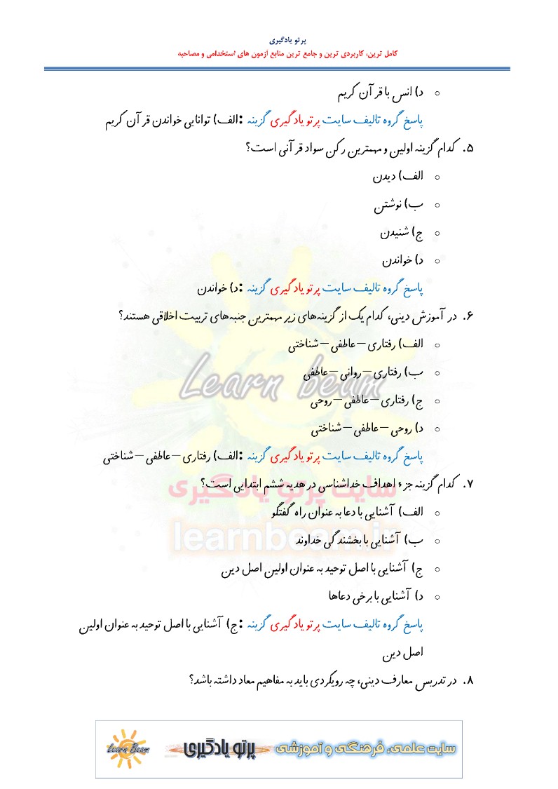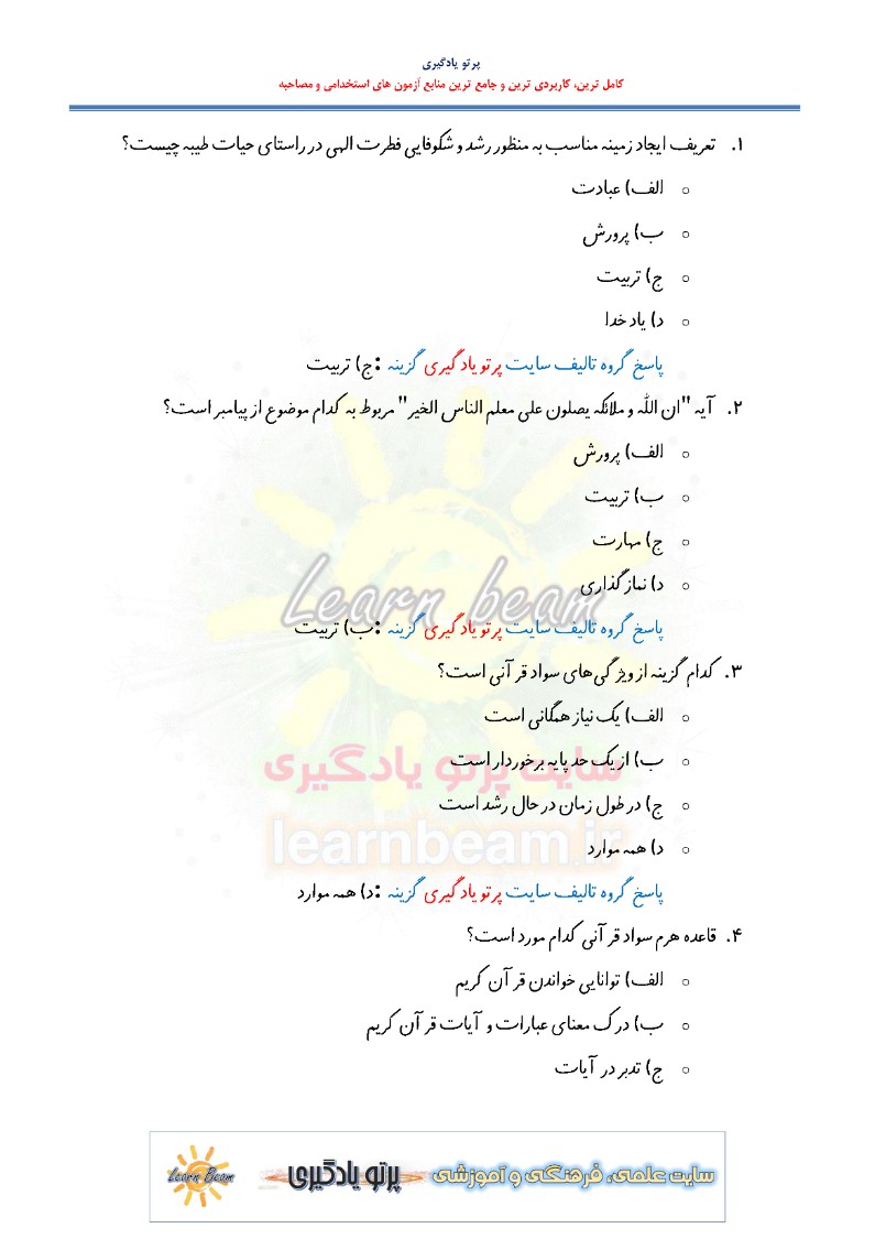 سوالات تستی روش تدریس قرآن و هدیه آسمانی دوره ابتدایی