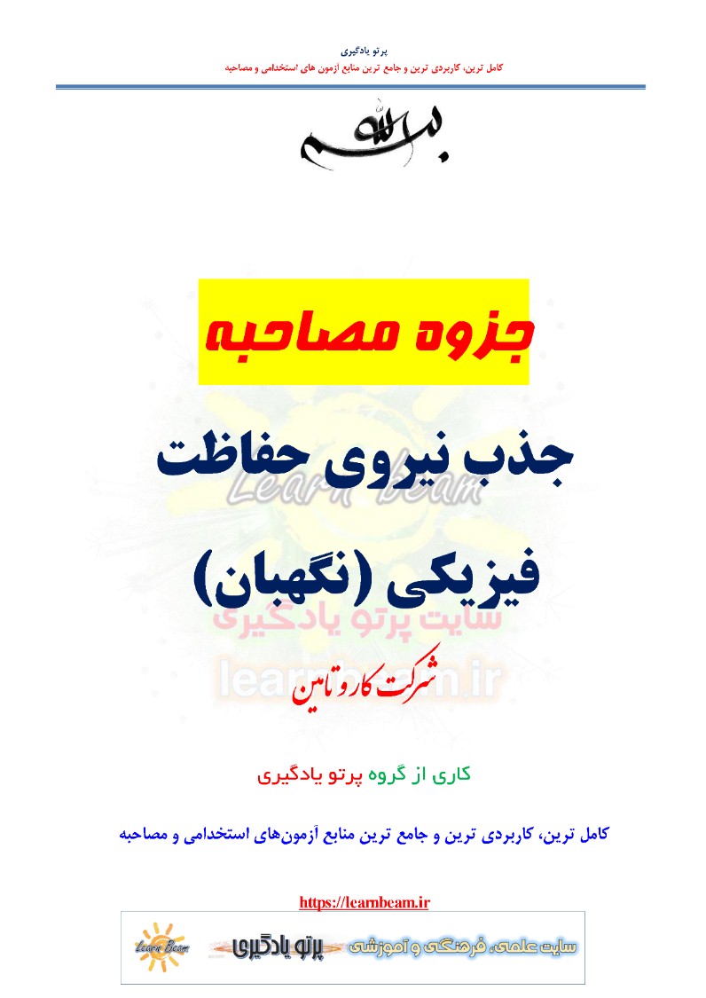 جزوه مصاحبه جذب نگهبان شرکت کار و تامین جزوه مصاحبه جذب نیروی حفاظت فیزیکی نگهبانی شرکت کار و تامین پک سوالات مصاحبه جذب نگهبان استخدامی تامین اجتماعی سال 1403 سوالات آمادگی برای مصاحبه جذب نگهبانی شرکت کار و تامین / مجموعه آمادگی برای مصاحبه جذب نگهبانی شرکت کار و تامین (با پاسخ پیشنهادی) در 162 صفحه در یک مجموعه در قالب فایل pdf. مطابق با سرفصل های دفترچه استخدامی شرکت کار و تامین سال 1403. شرکت کار و تامین در نظر دارد به منظور تامین نیروی انسانی مورد نیاز حفاظت فیزیکی (نگهبانی) برای سازمان تامین اجتماعی بر اساس فراخوان و اطلاع رسانی، آزمون کتبی و مصاحبه برگزار نموده و نیروهای مورد نیاز را به مدیریت درمان و اداره کل تامین اجتماعی استان های کشور جهت بکار گیری معرفی نماید. جزوه آمادگی برای مصاحبه جذب نیروی فیزیکی نگهبانی شرکت کار و تامین به منظور آمادگی عزیزان قبول شده در مرحله اول آزمون تهیه گردیده است. به امید موفقیت همه عزیزان