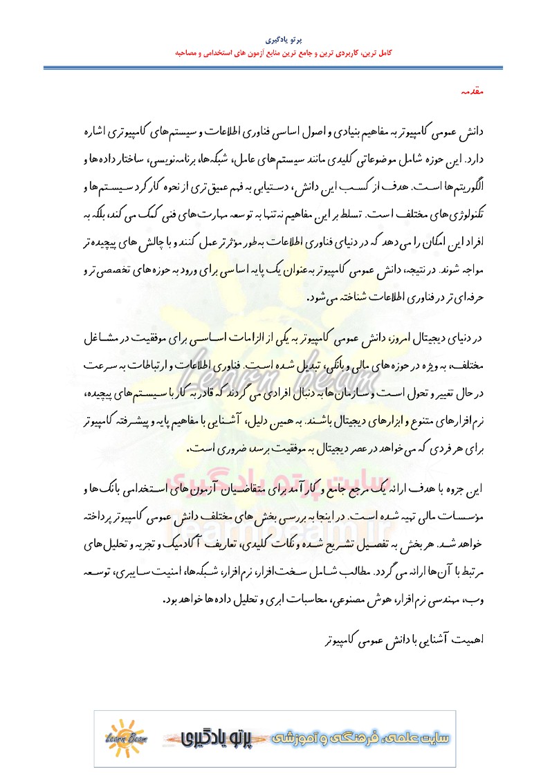 جزوه دانش عمومی کامپیوتر (منابع تخصصی استخدامی بانک ها) جزوه خلاصه دانش عمومی کامپیوتر آزمون استخدامی بانک ها در 112 صفحه به صورت pdf جزوه نکات کلیدی و چکیده دانش عمومی کامپیوتر شرکت کنندگان در آزمون استخدامی بانک ها را در مرور سریع کمک کرده و آن ها را یاری رسان خواهد بود. تهیهو مطالعه این جزوه به داوطلبین آزمون استخدامی بانک ها توصیه می شود.