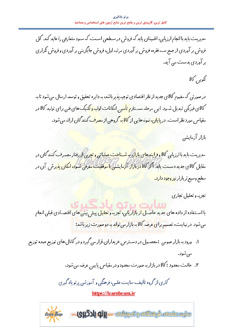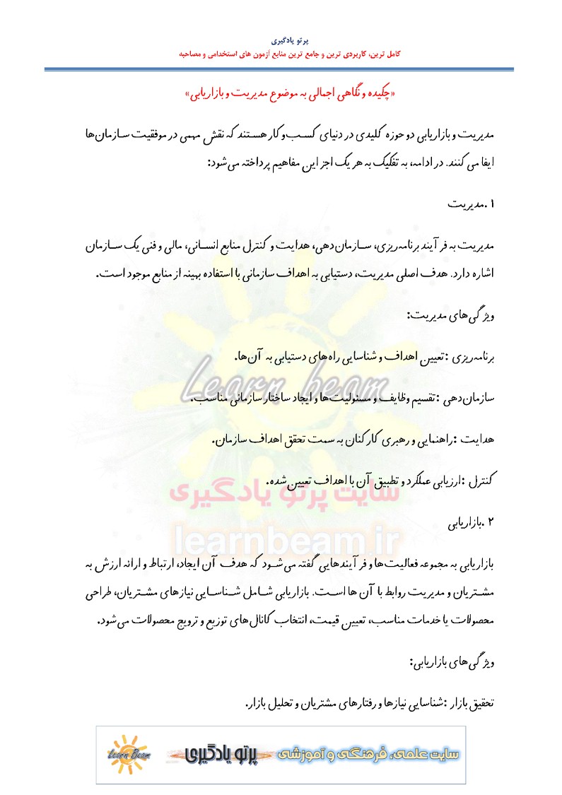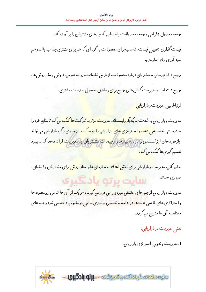 دانلود جزوه خلاصه مدیریت و بازاریابی جزوه خلاصه و نکات کلیدی مدیریت و بازاریابی آزمون استخدامی بانک ها شرکت کنندگان در آزمون استخدامی را در مرور سریع مفاهیم و موضوعات آماده نموده و یاری رسان خواهد بود . جزوه خلاصه مدیریت و بازاریابی می تواند داوطلبین آزمون استخدامی بانک ها را برای آزمون پیش رو آماده نماید. داوطلبین عزیز می توانند با تهیه، دانلود و مطالعه مجموعه نکات کلیدی و خلاصه مدیریت و بازاریابی بهتر از سایر شرکت کنندگان در آزمون استخدامی بانک ها عمل نمایند.