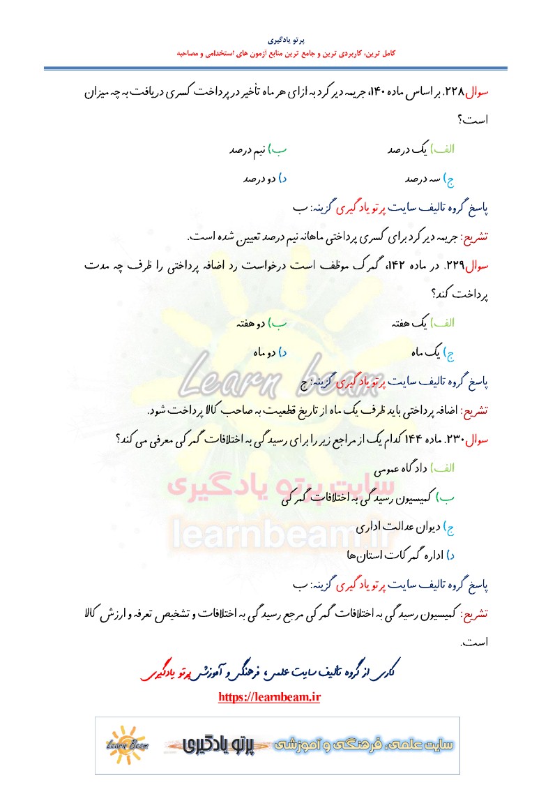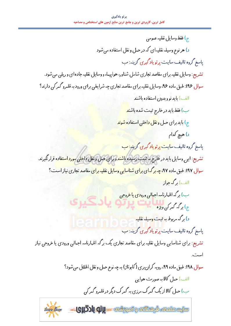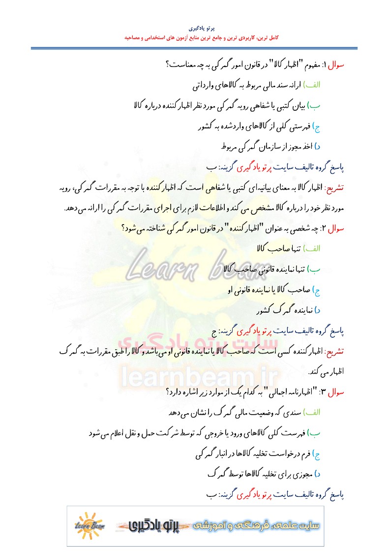 سوالات تستی قانون امور گمرکی شامل 230 تست در 86 صفحه در قالب فایل pdf با پاسخ تشریحی قابل چاپ با کیفیت عالی جهت انسجام ذهنی، خودآزمایی و مطالعه سریع داوطلبین شرکت کننده در آزمون های استخدامی و دوازدهمین امتحان مشترک فراگیر دستگاه های اجرایی کشور مطابق با دفترچه ثبت نام و مطابق با سرفصل های اعلام شده در دفترچه راهنمای ثبت نام می باشد.