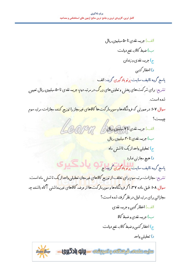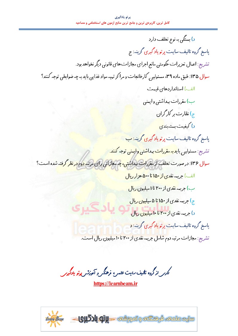 تست قانون تعزیرات حکومتی امور بهداشتی و درمانی سوالات تستی قانون تعزیرات حکومتی امور بهداشتی و درمانی شامل 136 سوال در 49 صفحه در قالب فایل pdf با پاسخ تشریحی می باشد. مجموعه سوالات تستی قانون تعزیرات حکومتی امور بهداشتی و درمانی قابل چاپ با کیفیت عالی جهت انسجام ذهنی، خودآزمایی و مطالعه سریع داوطلبین شرکت کننده در آزمون های استخدامی و در دوازدهمین امتحان مشترک فراگیر دستگاه های اجرایی کشور در سال 1403 مطابق با دفترچه راهنمای ثبت نام آزمون و اصلاحیه نهایی می باشد.